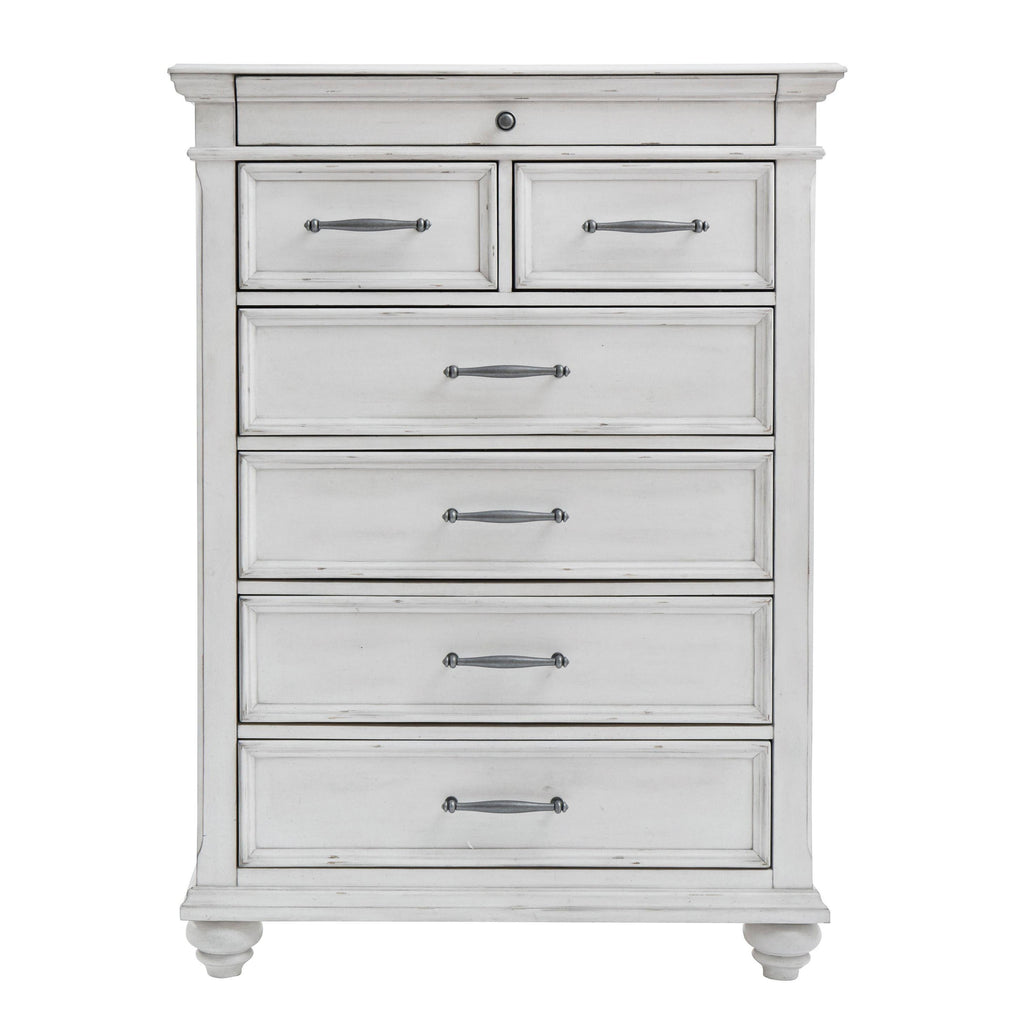 Give your retreat vintage charm with this king panel bed. In a beautifully distressed whitewash finish, you'll love the headboard's... Give your retreat vintage charm with this king panel bed. In a beautifully distressed whitewash finish, you'll love the headboard's grand style featuring a picture framed panel. Generously scaled moulding from top to bottom, along with bun feet give this bed character—evoking the feel of a quaint cottage escape. Dresser, mirror, chest and 2 nightstands included. View more
