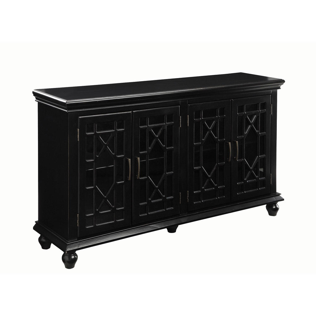 • Features four glass cabinet doors with geometric latticework