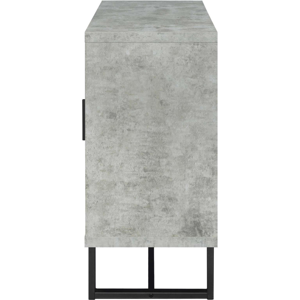 • Distressed weathered oak finish on the cabinet front pairs well with the faux cement frame