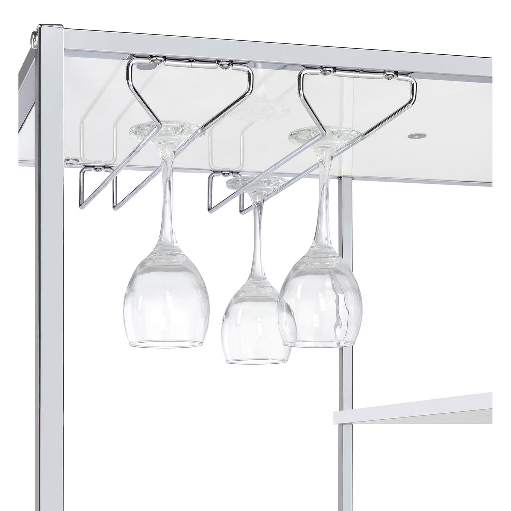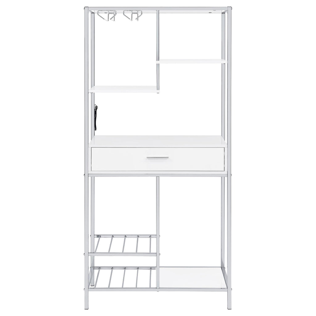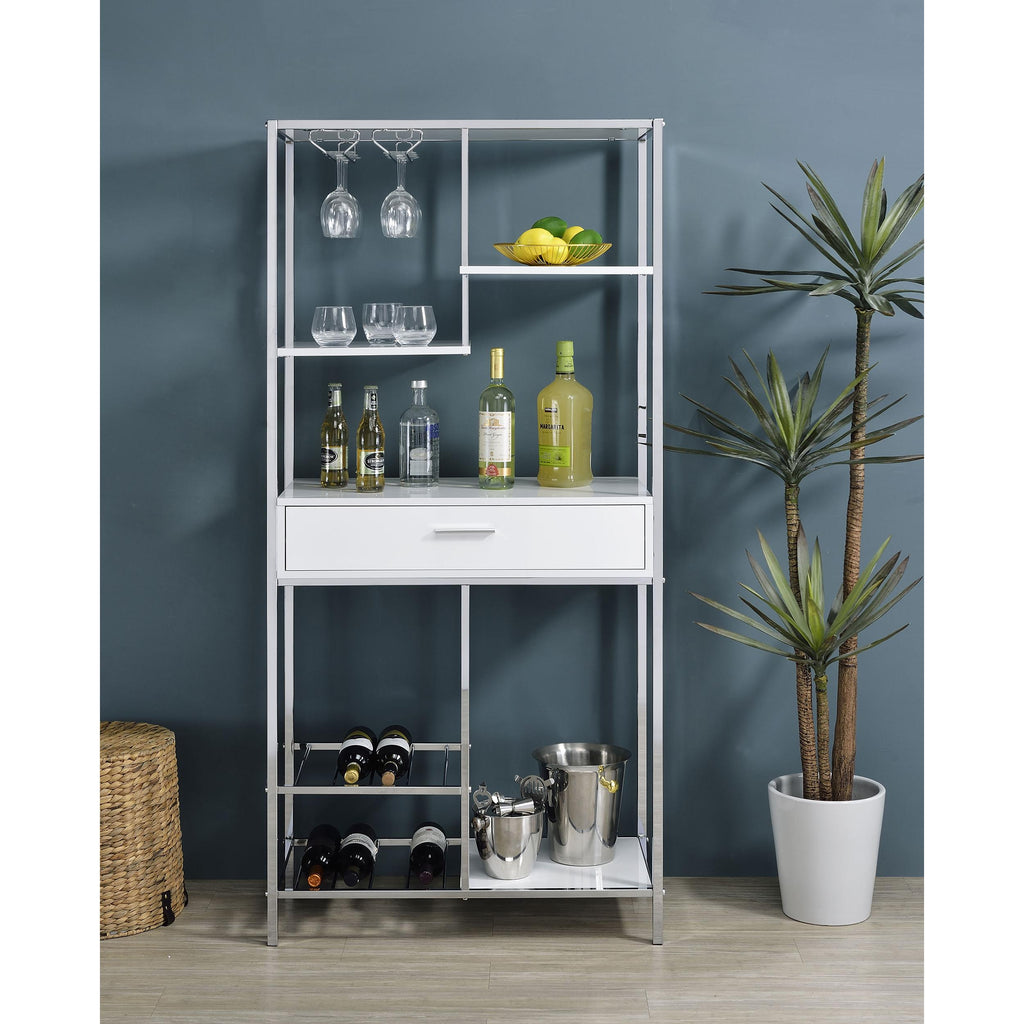 A modular design with integrated LED lighting offers a fresh, modern look, perfect for hosting guests in your contemporary setting.... A modular design with integrated LED lighting offers a fresh, modern look, perfect for hosting guests in your contemporary setting. This wine cabinet features a minimalist and linear design with four open shelves, a convenient pull-out drawer, two tiers of wine bottle storage, and integrated stemware racks. Constructed from engineered wood in a white high-gloss, scratch-resistant finish, it is complemented by a sleek silver-finished rectangular frame. Combining style and functionality, it’s an ideal choice for serving and entertaining. View more