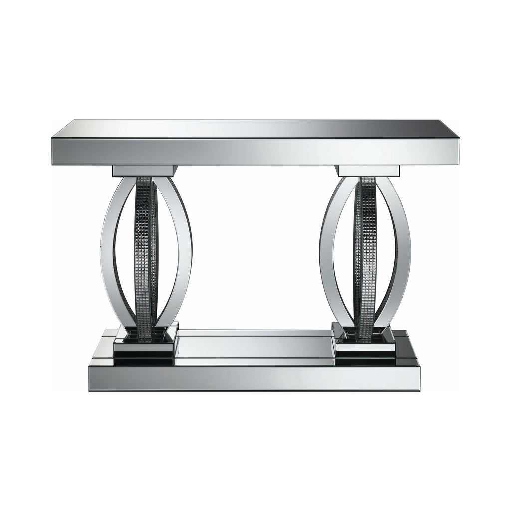 • Mirrored console table with sleek rectangular top and bold oval-shaped bases