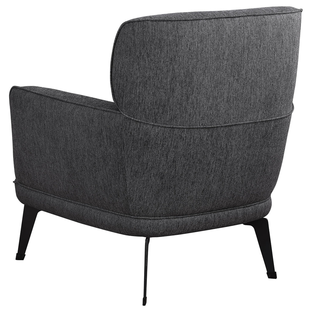 • Chic accent chair with modern and transitional style elements, upholstered in luxurious fabric, rounded track arms, deep non-removable seat cushion, and black metal legs