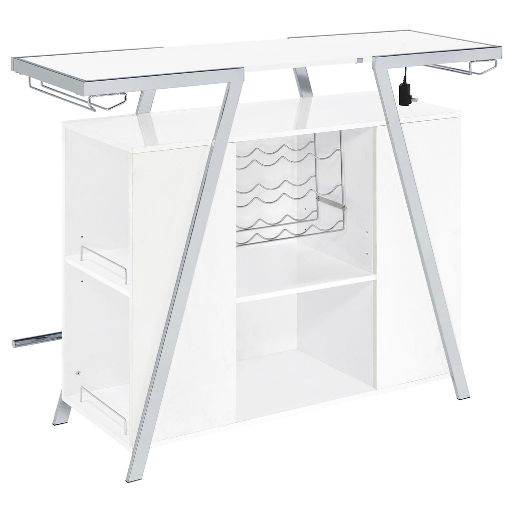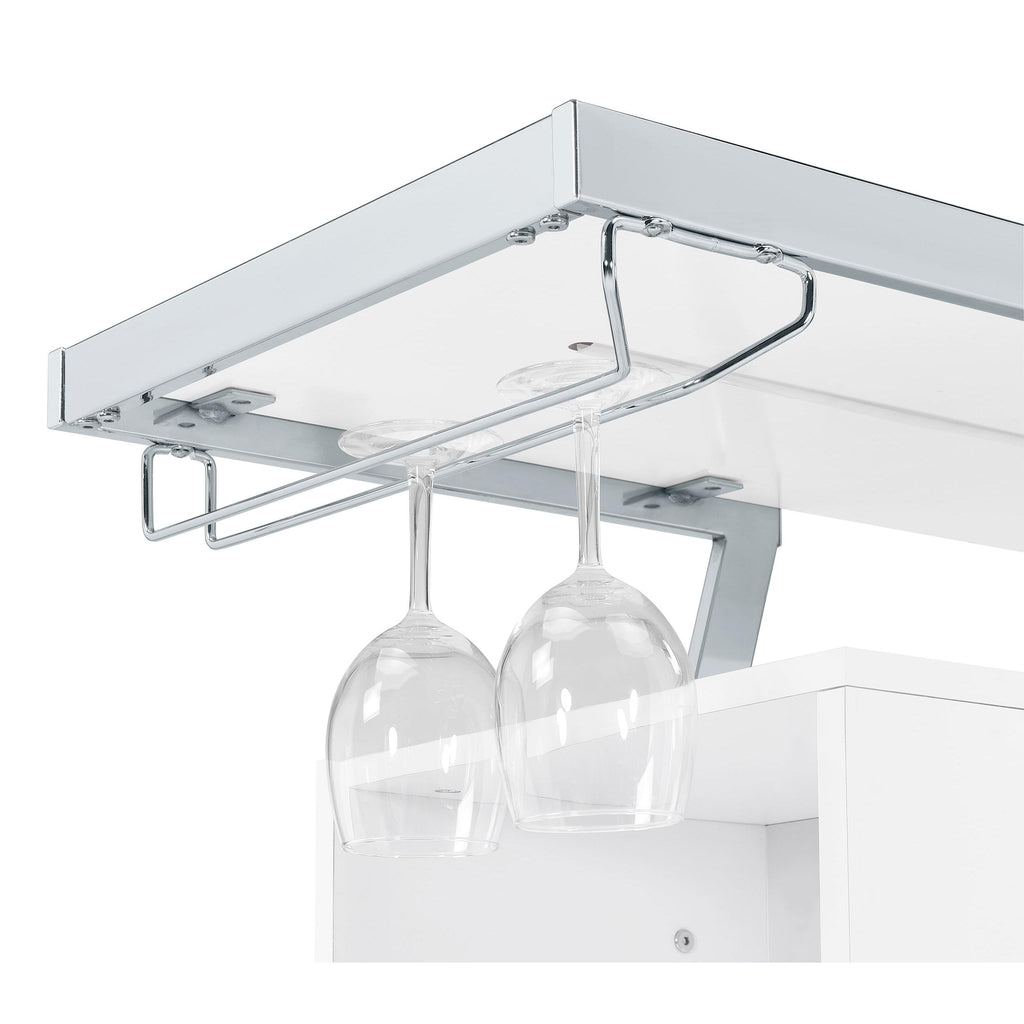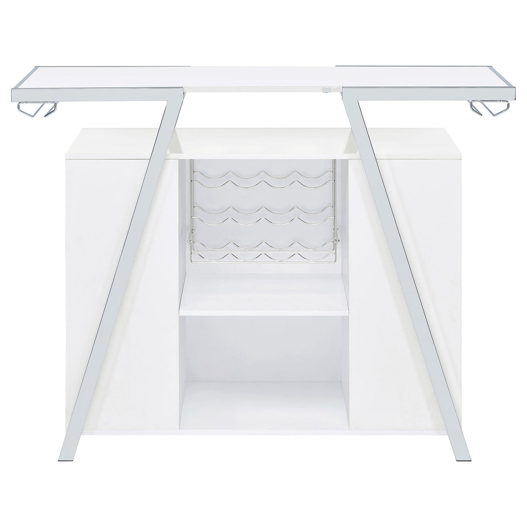 • Modular-inspired and contemporary home bar constructed of MDF, paper coating, and veneer with bright white finish and metal framing with geometric motif