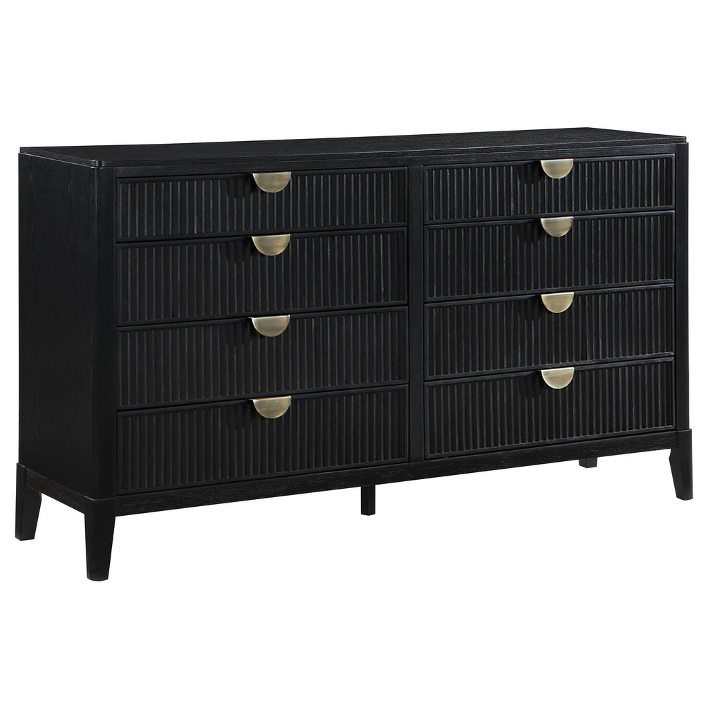 Fluted texturing and demi-lune drawer pulls perfectly accentuate the modern artistry featured in a five-piece bedroom set. Offering sophisticated presence... Fluted texturing and demi-lune drawer pulls perfectly accentuate the modern artistry featured in a five-piece bedroom set. Offering sophisticated presence and a wire brushed black finish, the set is a superb choice in a refined bedroom. The dresser and chest provide plenty of storage for clothing, complete with felt lined top drawers that offer protection for delicate items. Half-moon drawer pulls add stylish presence and metallic contrast. The bed centers the set, featuring a low footboard for an open, airy presentation that looks splendid with your choice of linens. This set includes the bed headboard, footboard and rails, a chest, a nightstand, a dresser and the dresser mirror. View more