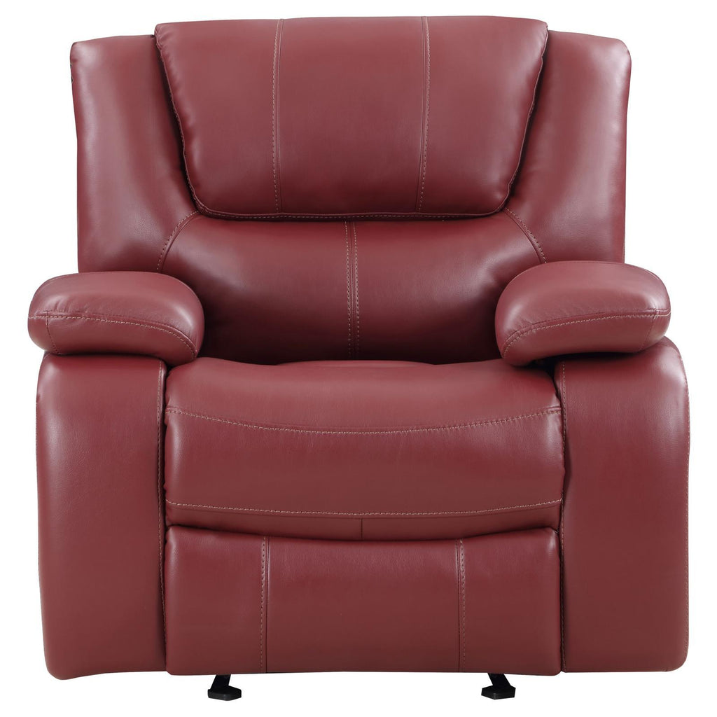 • Extra-wide design provides supreme comfort with padded glider recliner and smooth red leatherette upholstery;
