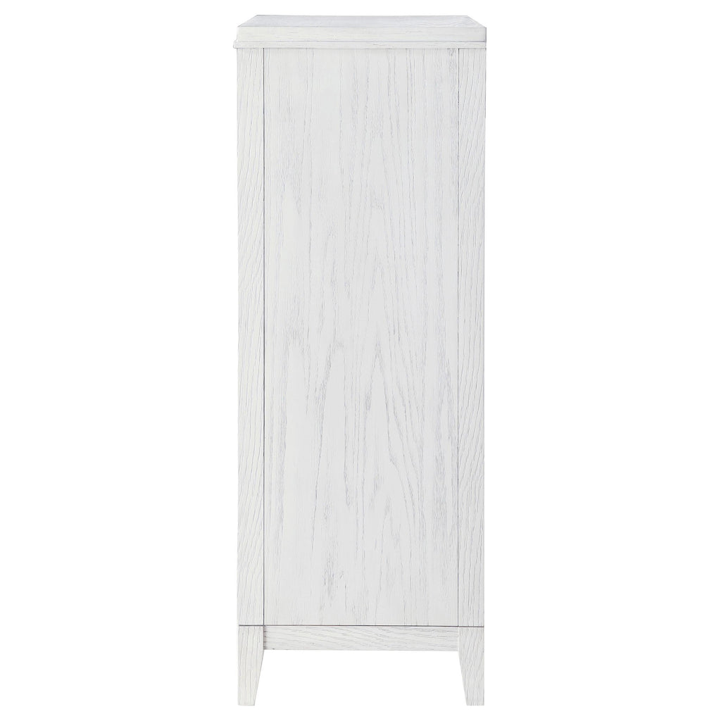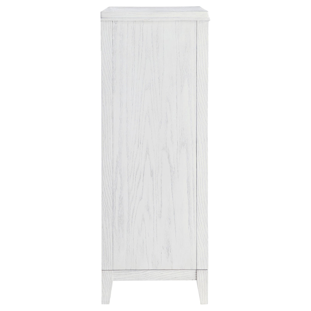 • Distressed white finish highlights wood grain details and bar hardware to create texture and depth