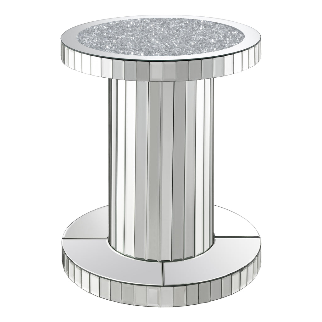 • The round tabletop is encrusted with a crystal acrylic material for a luxe touch