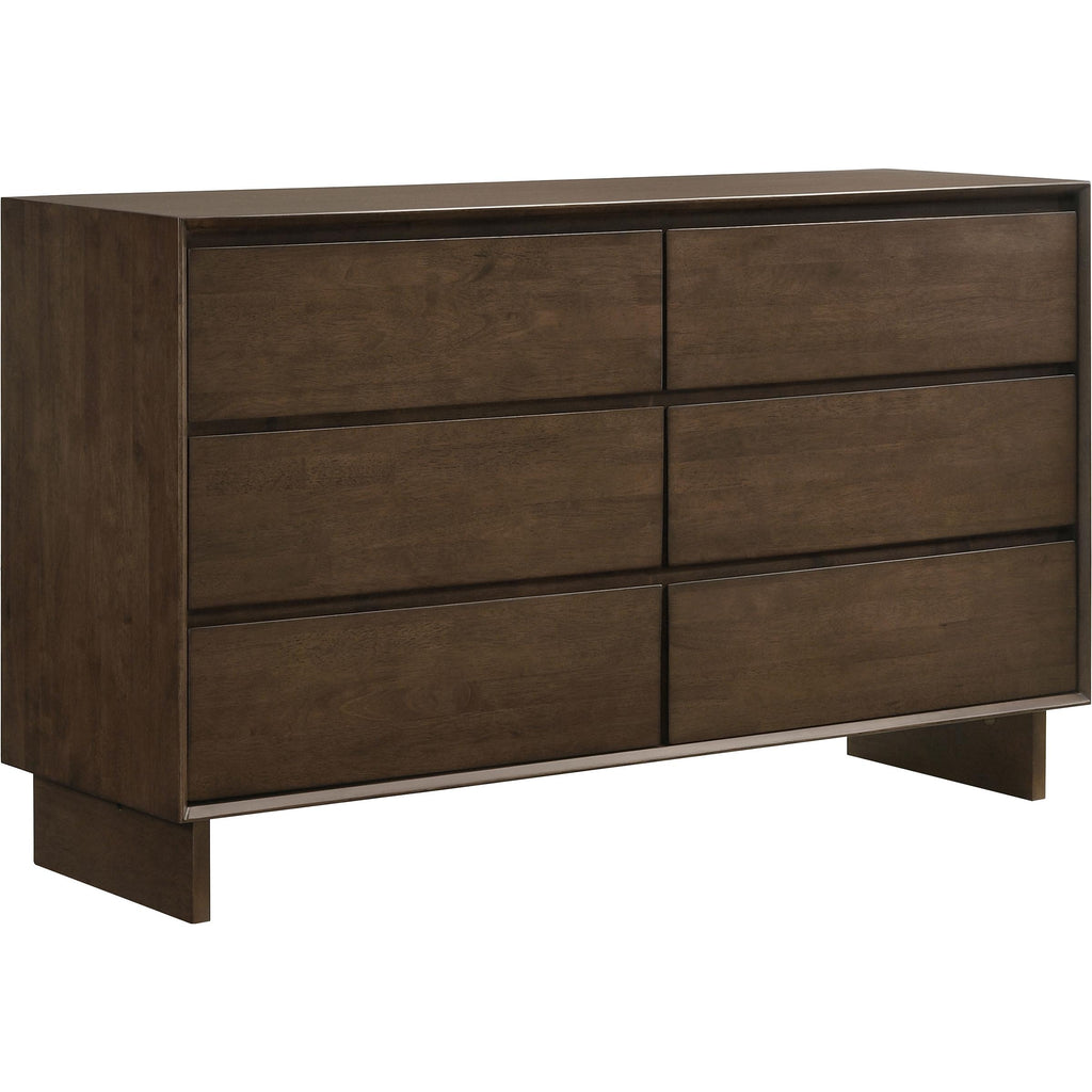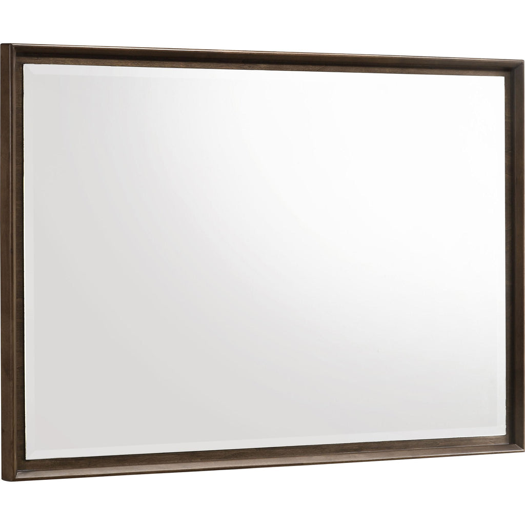 Create a handsome, refined space for rest and relaxation with this modern bedroom set. Crafted in solid wood with a... Create a handsome, refined space for rest and relaxation with this modern bedroom set. Crafted in solid wood with a warm brown finish, the set delivers a handsome bed and plenty of storage for clothing and accessories. The nightstand provides a perfect spot for a reading lamp and a great book. The dresser includes a framed mirror, adding lightness and reflectivity while providing a spot for grooming and beauty rituals. This stylish set features platform bed with a tall panel headboard and low rails, offering a refined, understated centerpiece in your bedroom. View more