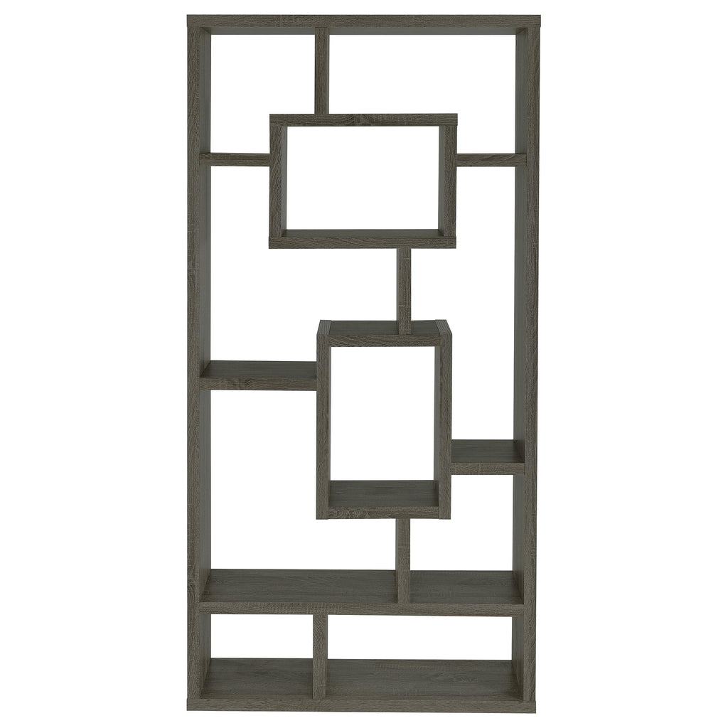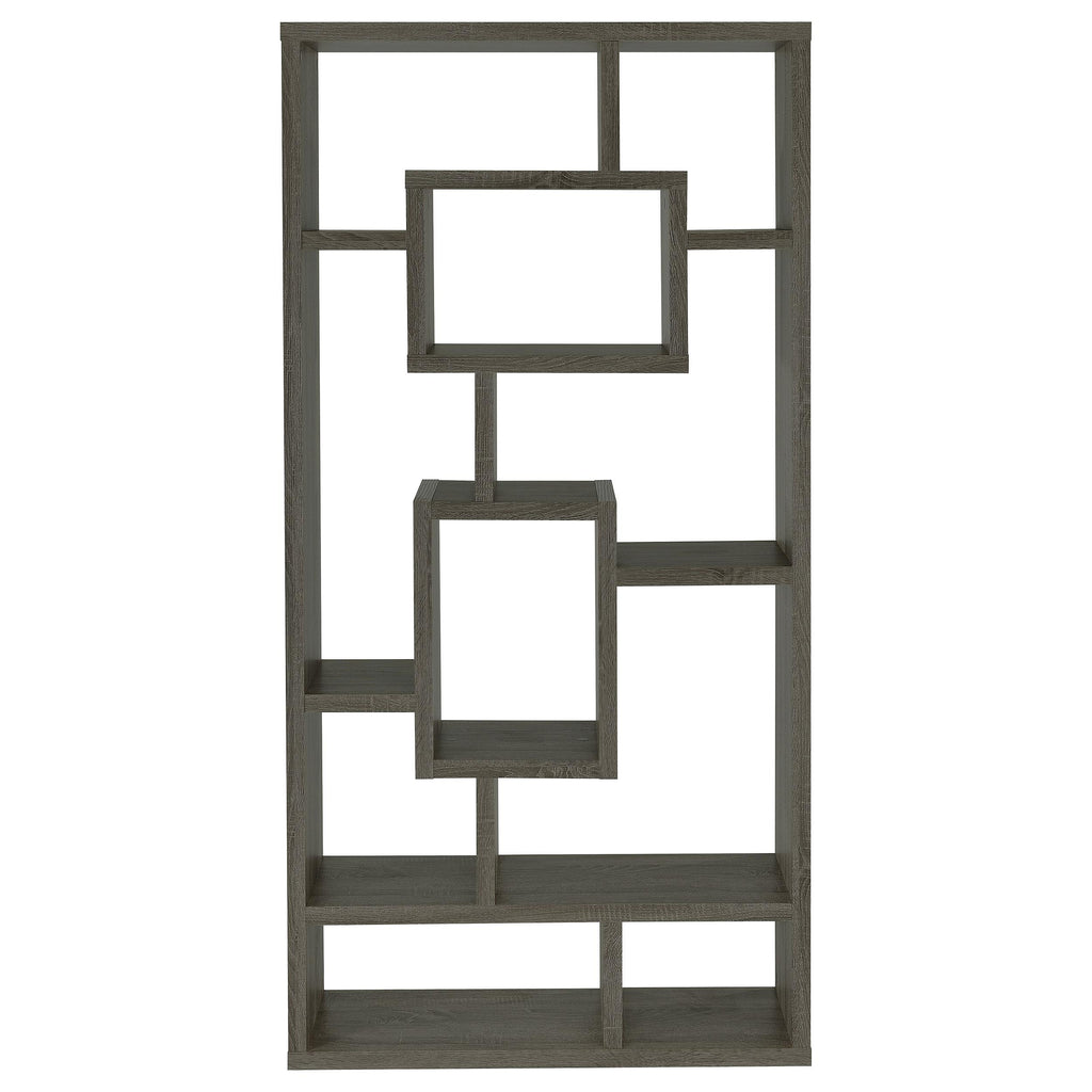 • Geometric bookcase with varying boxes creates an eye-catching display for books and collectibles