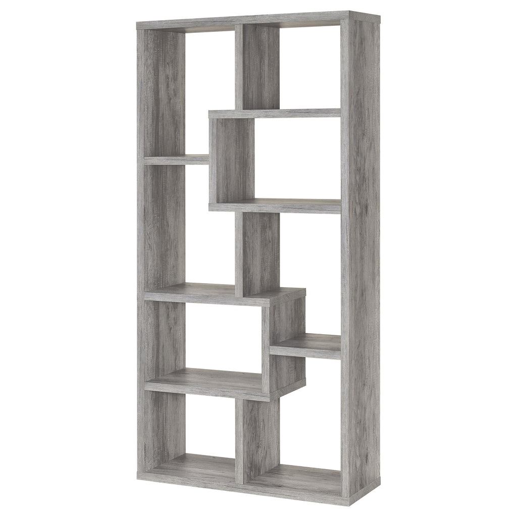 • Geometric bookcase with a seemingly random pattern of boxes creates an attention-grabbing display for your favorite keepsakes and books