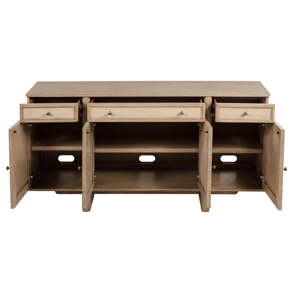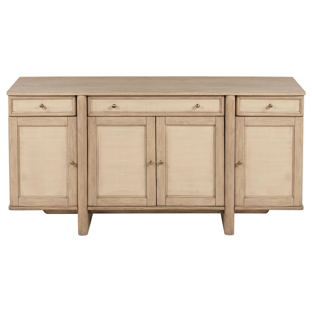 Bring both beauty and functionality to your dining or living space with this elegantly crafted sideboard. Featuring a warm, beige... Bring both beauty and functionality to your dining or living space with this elegantly crafted sideboard. Featuring a warm, beige oak wood finish, this sideboard offers ample storage with three spacious drawers and three cabinet compartments behind four doors, perfect for organizing dinnerware, linens, or other essentials. The hand-woven cane door fronts add a touch of artisanal charm, while the adjustable interior shelves provide versatility for your storage needs. The rear cutouts allow for easy cable management, making it suitable for use as an entertainment center or buffet. Whether you’re looking to enhance your dining room, living area, or hallway, this sideboard delivers timeless style and practical functionality. View more