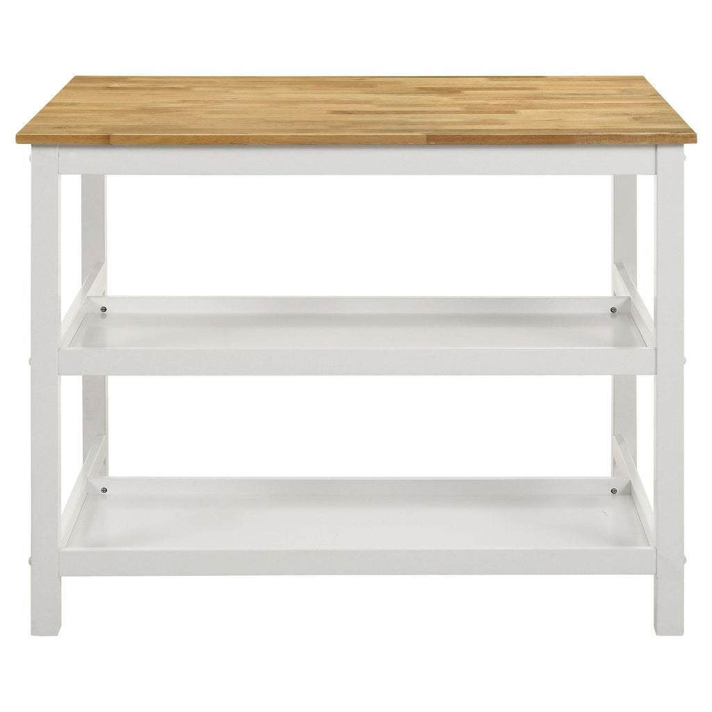 • Expand workspace and storage with a modern farmhouse kitchen island featuring a natural brown wood finish top and white base with two shelves