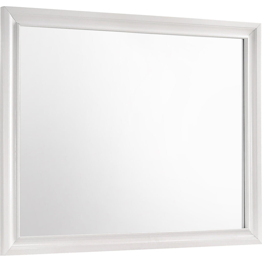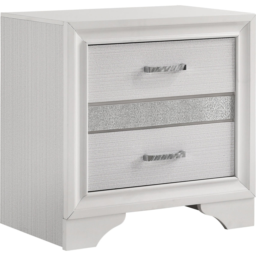 Encourage a glam vibe in your refined bedroom with a modern four-piece bedroom set. Centering on a stylish bed with... Encourage a glam vibe in your refined bedroom with a modern four-piece bedroom set. Centering on a stylish bed with an upholstered headboard and low footboard, the set includes a two-drawer nightstand for easy bedside storage and display space. A seven drawer dresser and mirror complete the set, adding diamond-like trim across its face that catches the light and offers a sophisticated touch. Bracket feet add a touch of dimensionality and movement to each piece and jewel-like bar pulls add intriguing sparkle. A cool white finish is textured, while white finish trim is smooth, creating a touch of textural contrast that add engaging style. View more