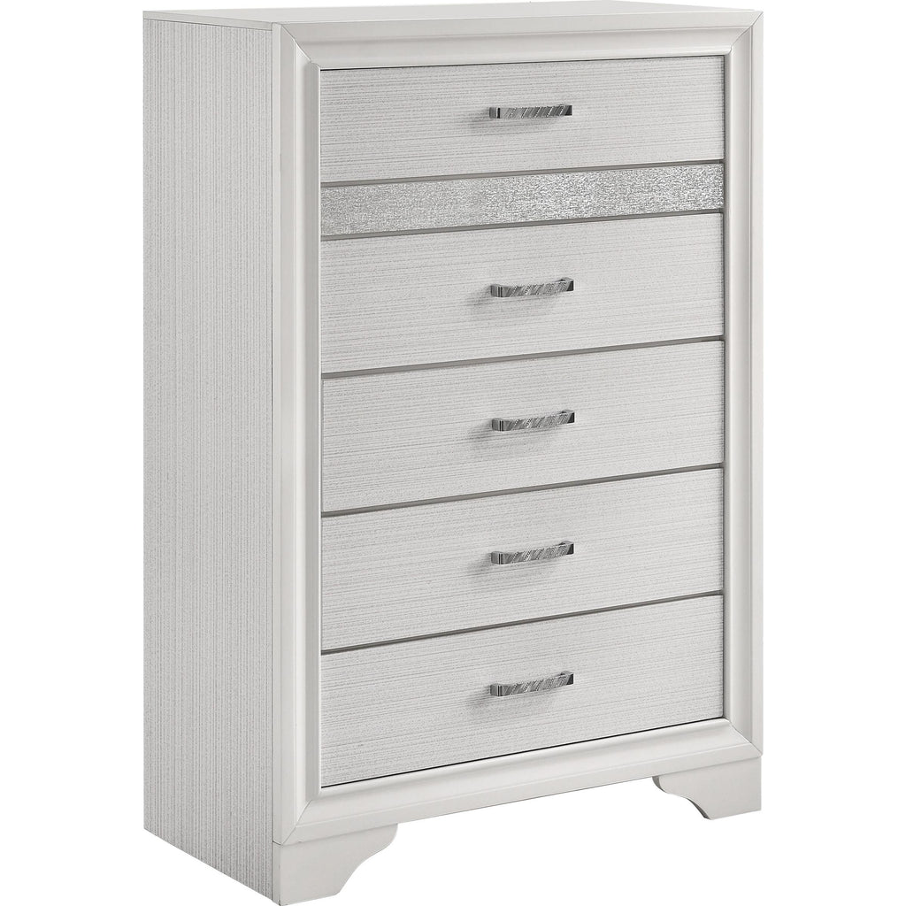 Sparkling diamond-like trim ups the glamour for a five-piece modern bedroom set. Compelling in its elegant simplicity, it centers on... Sparkling diamond-like trim ups the glamour for a five-piece modern bedroom set. Compelling in its elegant simplicity, it centers on an upholstered bed and features a lightly textured white finish paired with smooth white molded trim. A nightstand, dresser with mirror, and chest provide plenty of drawers for easy storage and organization. Stripes of glittering, diamond-like trim and jewel-like bar pulls elevate the set, creating a fresh, sophisticated look and feel for your bedroom. Bracket feet complete the look with a touch of movement. View more