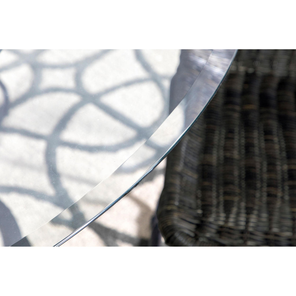 • A meticulously crafted metal table base with elegant curvaceous legs converging around an interlocking ring waist, crowned with a 6mm 48" diameter clear tempered glass