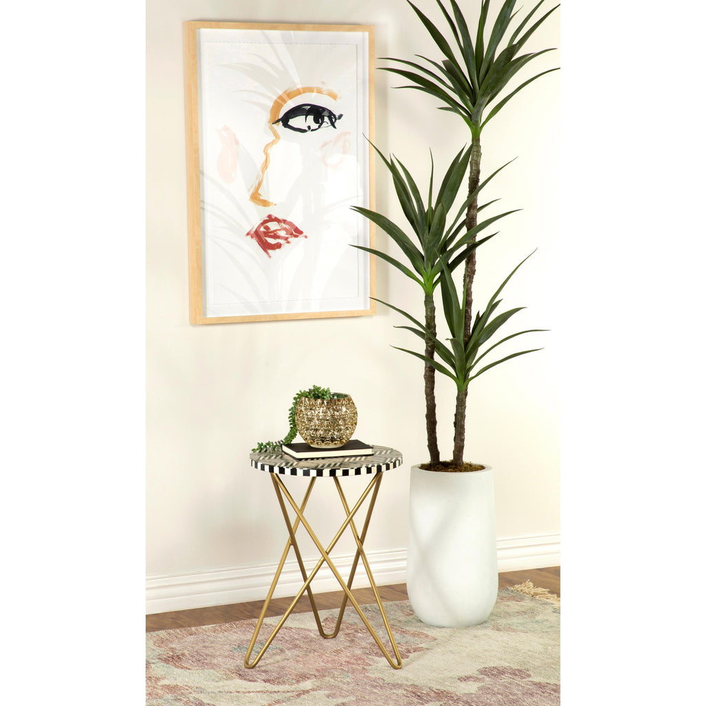 Bold prints and classic designs come together to create this contemporary accent table. Featuring a playful mosaic motif in a... Bold prints and classic designs come together to create this contemporary accent table. Featuring a playful mosaic motif in a contrasting white bone and black resin hand-inlaid design, this stunning side table offers a dramatic focal point to liven up compact spaces. The round tabletop rests gracefully on a butterfly style, hairpin leg tripod base in a lustrous gold finish for a glam touch. Place this charmingly chic accent table beside a chair for place to keep a book or cocktail. Or keep it in an entryway foyer to showcase your favorite plant or vase. View more