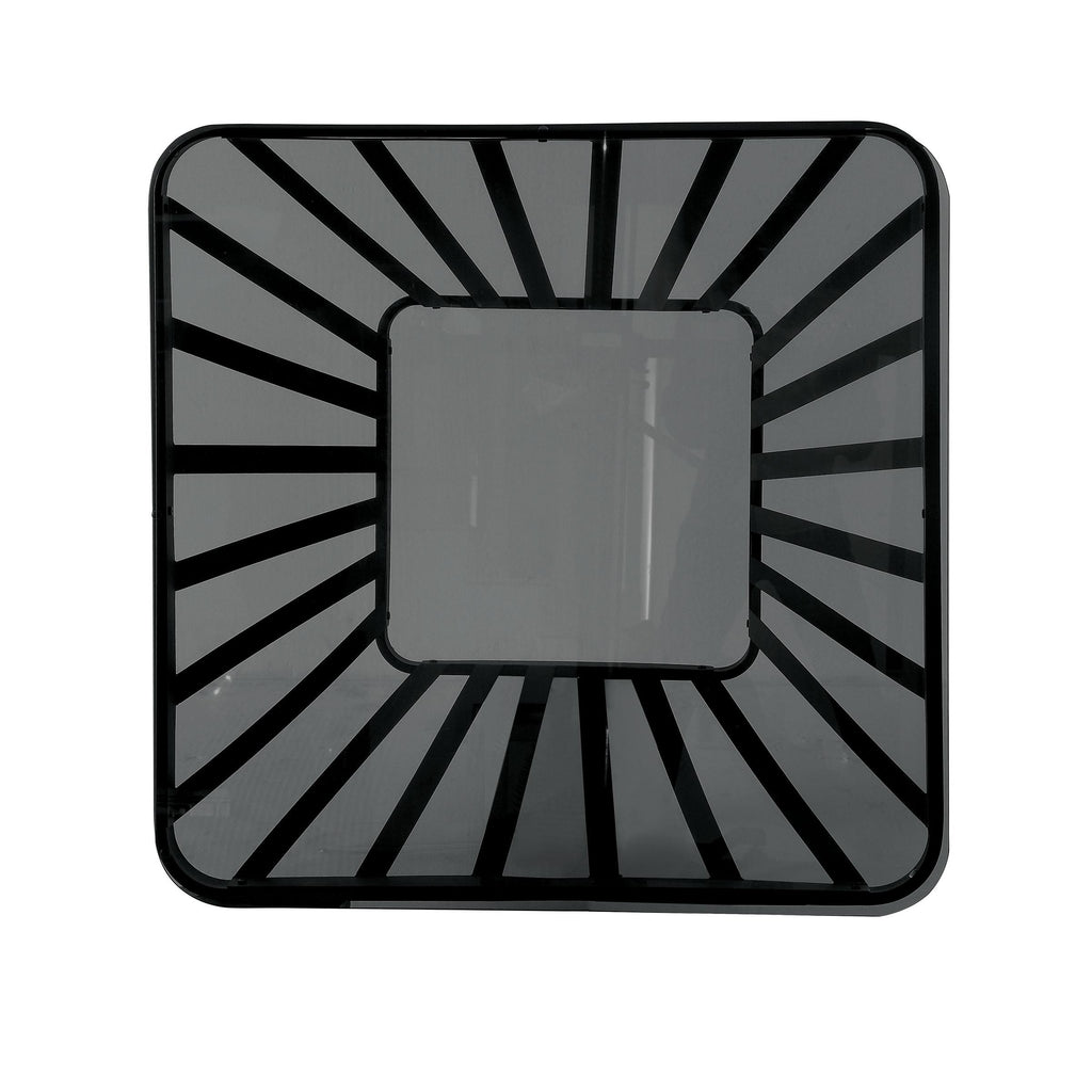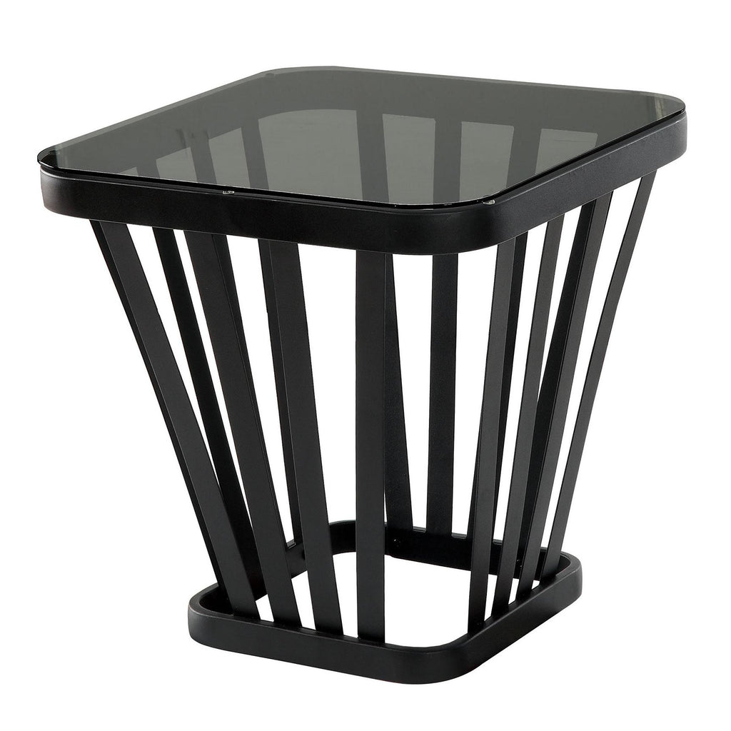 This sophisticated design helps highlight the warmth and inviting ambiance of your home with its open and airy base. Multiple... This sophisticated design helps highlight the warmth and inviting ambiance of your home with its open and airy base. Multiple metal slats stretch up from the square base, drawing attention to the rounded corners defining the square table. Complete with a gray tempered glass top, this table offers the perfect finishing touch to make your living room one-of-a-kind. View more