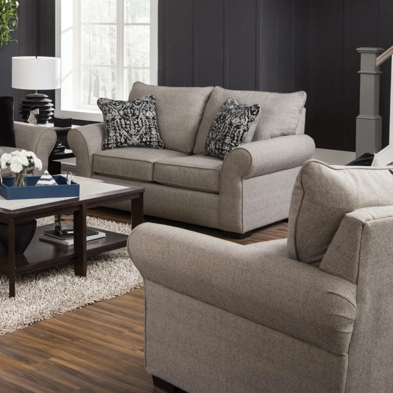 This comfortable living room set will make a beautiful addition to your living room. It features t-style back pillows, padded... This comfortable living room set will make a beautiful addition to your living room. It features t-style back pillows, padded seat cushions, sock arms, and wooden block feet. It is adorned with welting details and upholstered in soft fossil polyester textured fabric. It is composed of a stationary sofa and loveseat. View more