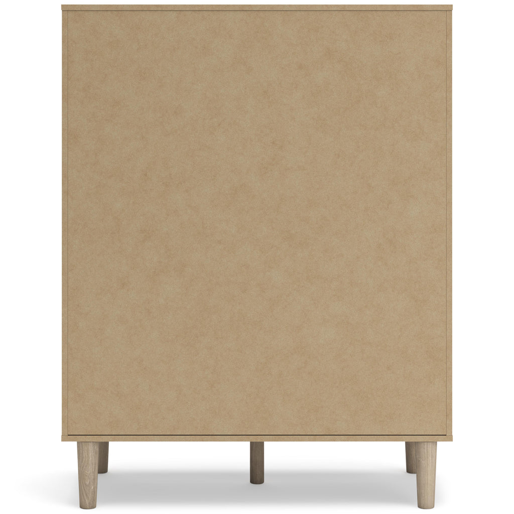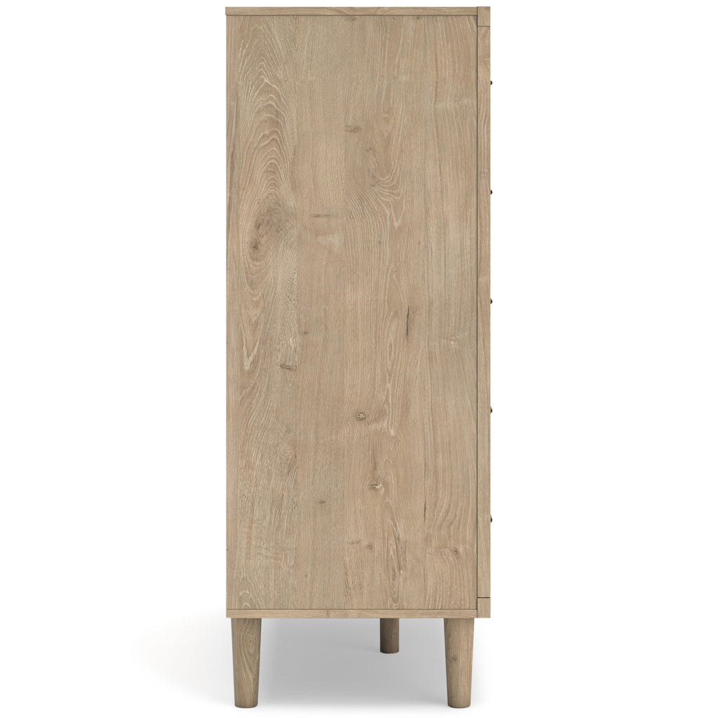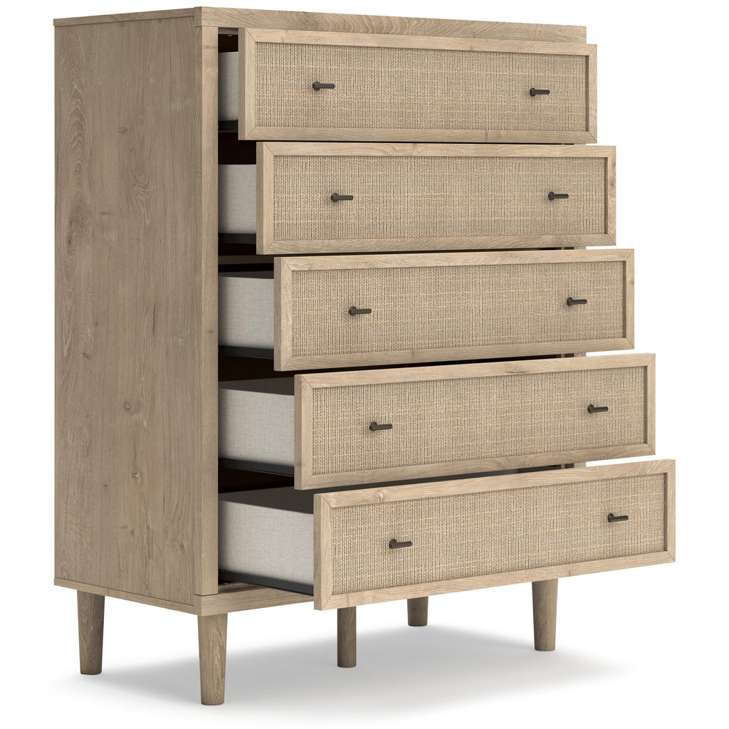• Framed drawer fronts with textured beige finish that replicates the look of cane