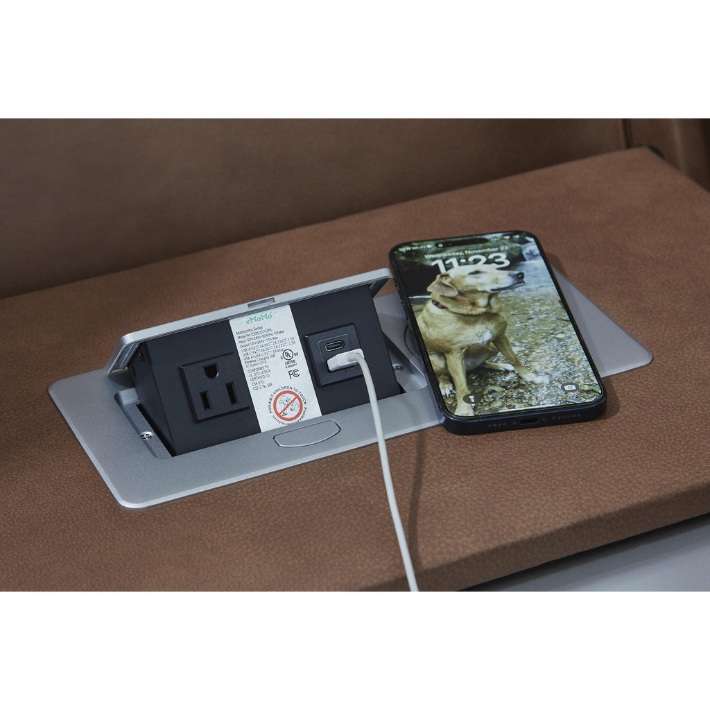 • Drop-down table with LED reading lights, dual cup holders, electrical outlet, USB charging (USB-A and USB-C) and wireless charging