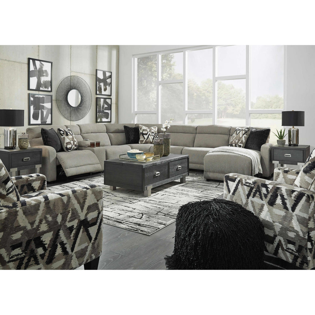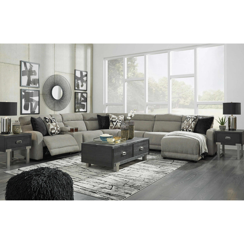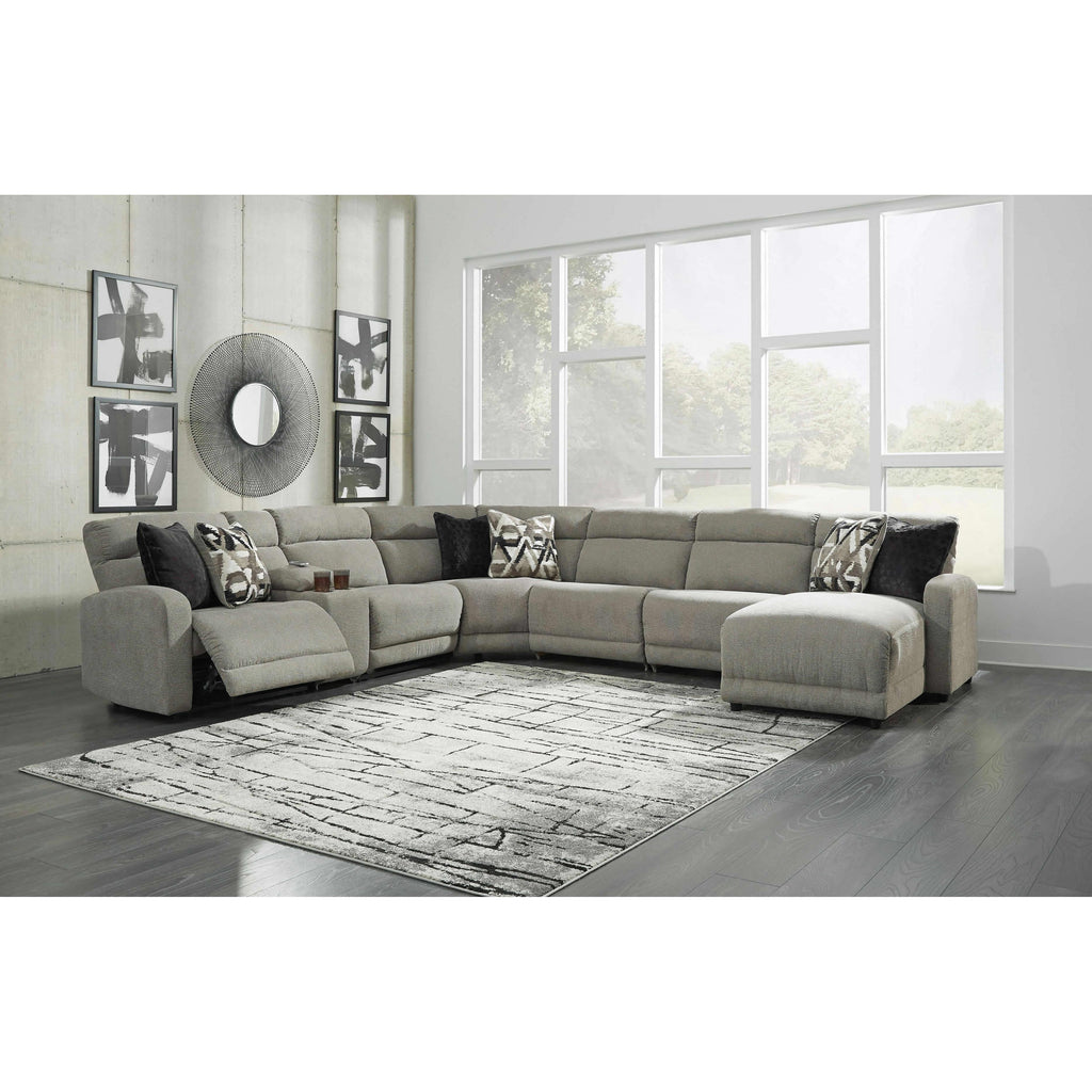 • Includes 7 pieces: left-arm facing power recliner, armless power recliner, console with storage, wedge, right-arm facing power reclining back chaise and 2 armless chairs
