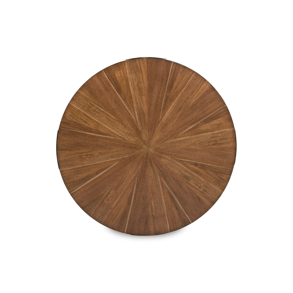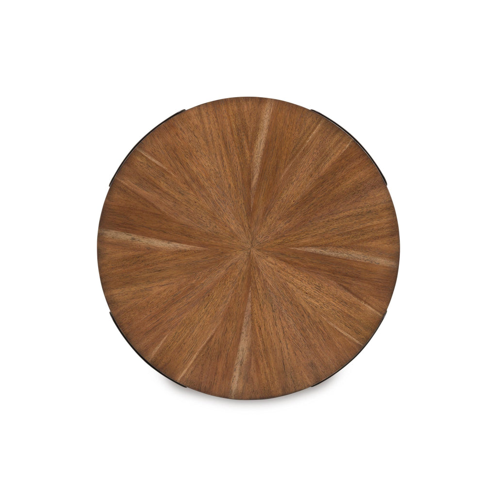 This occasional table set contrasts a rich brown wood tone with dark bronze-tone metal legs for a casual contemporary feel.... This occasional table set contrasts a rich brown wood tone with dark bronze-tone metal legs for a casual contemporary feel. An inlay sunburst pattern on the tabletops channels both modern aesthetics and the comforting vibe of natural materials. Complete with a coffee table and matching end tables, this set is sure to add chic character to your living space. View more