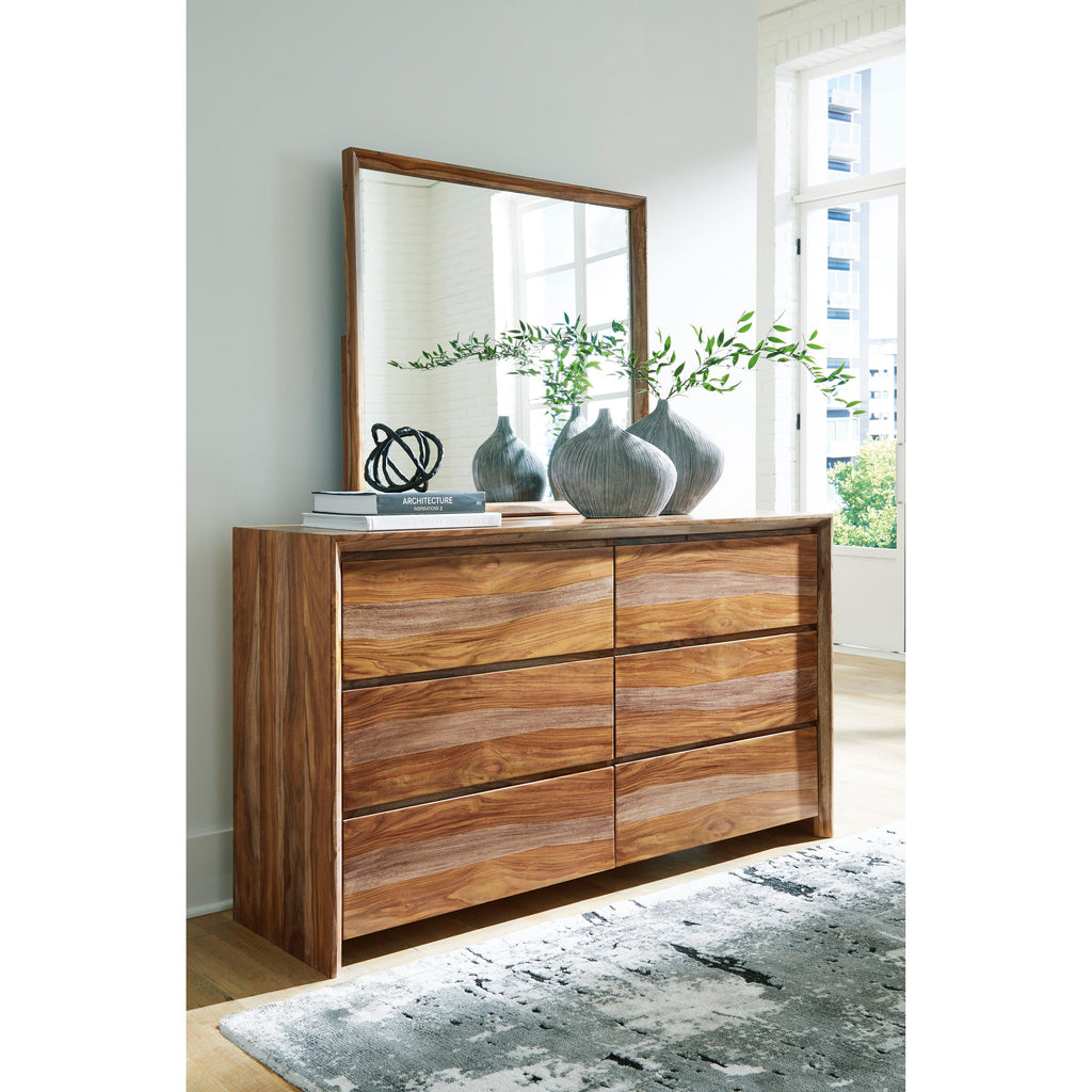 This Dressonni 8-piece king panel bedroom offers a rich natural beauty of the wood, enhanced with a clear wood-tone finish.... This Dressonni 8-piece king panel bedroom offers a rich natural beauty of the wood, enhanced with a clear wood-tone finish. This set includes a king panel headboard, footboard, rails, dresser, mirror, chest, and 2 nightstands. View more