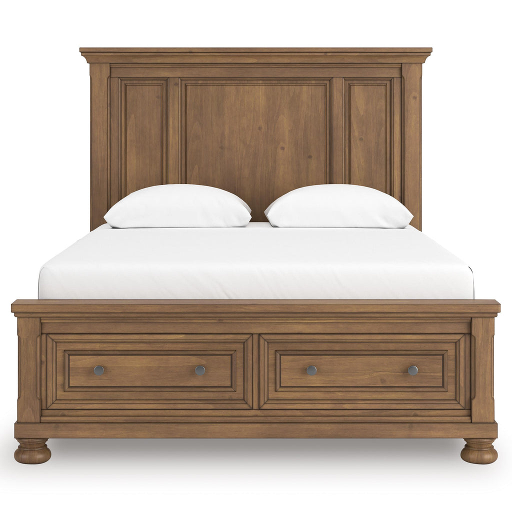• Includes panel headboard, storage footboard and rails with roll slats