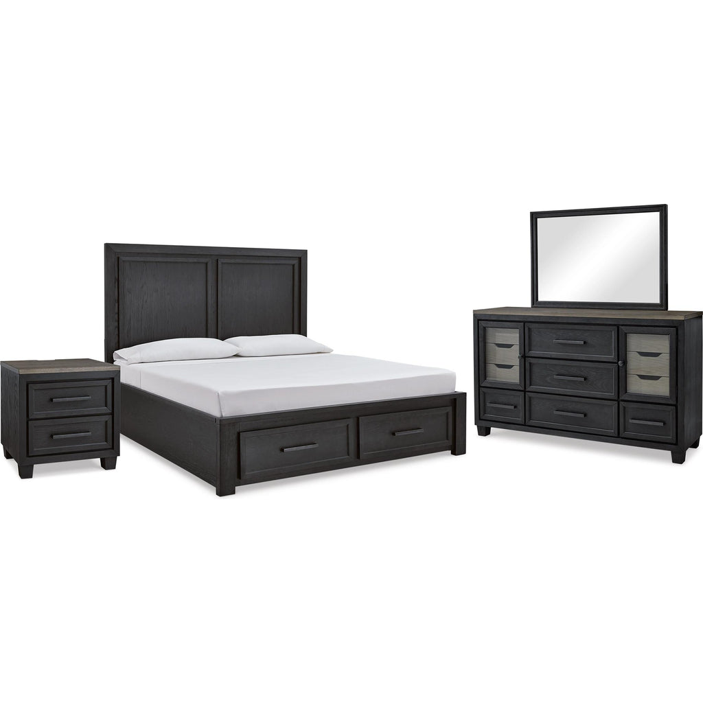 This panel storage bed is casual style simply done right. Its two-tone color scheme and picture frame headboard provide just... This panel storage bed is casual style simply done right. Its two-tone color scheme and picture frame headboard provide just the right touch of contemporary charm. Two deep storage drawers generously accommodate your wardrobe needs with ease. Dresser, mirror and nightstand included. View more