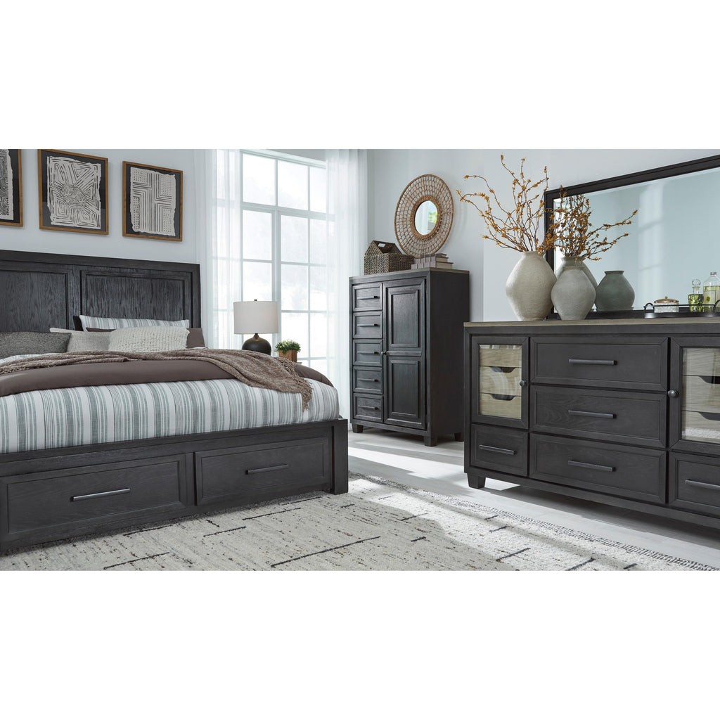 • Includes king panel headboard, storage footboard, and rails with roll slats