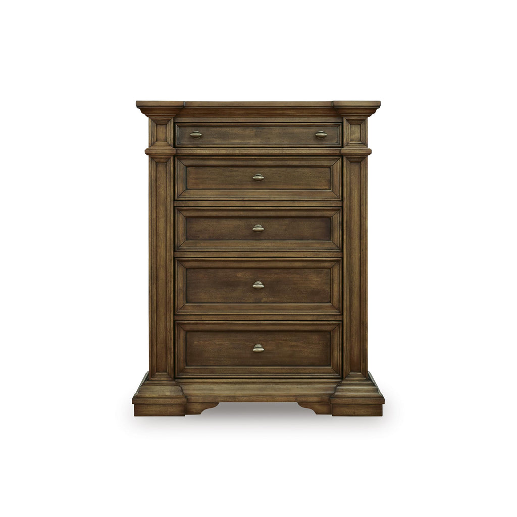Time-honored style, made for today's home. This chest of drawers pays homage to traditional aesthetics, with a richly detailed finish... Time-honored style, made for today's home. This chest of drawers pays homage to traditional aesthetics, with a richly detailed finish incorporating a sense of stately elegance. Substantially-scaled moulding details and antiqued brass-tone knobs round out the piece in graceful fashion. View more