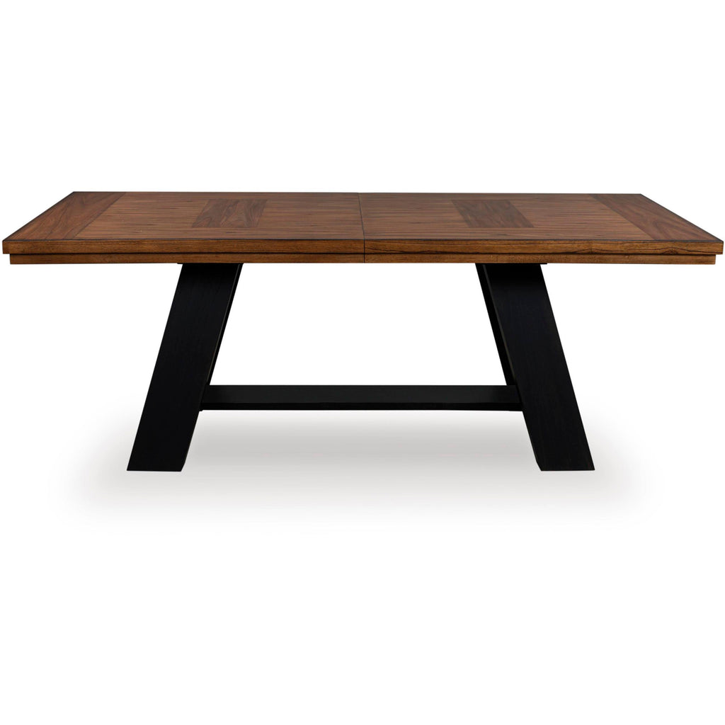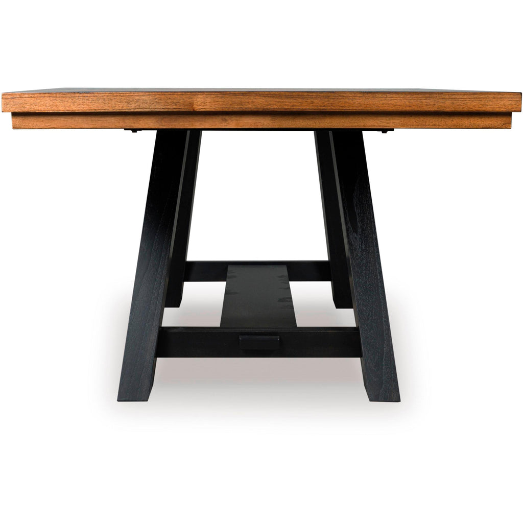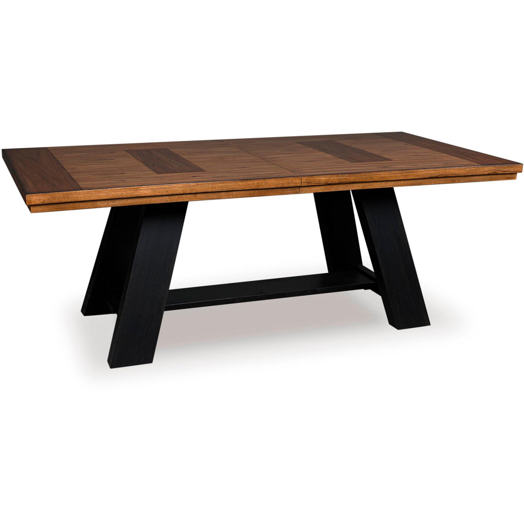 • Two-tone finish (mindi wood veneer inlay top with medium brown finish; base with painted black finish)