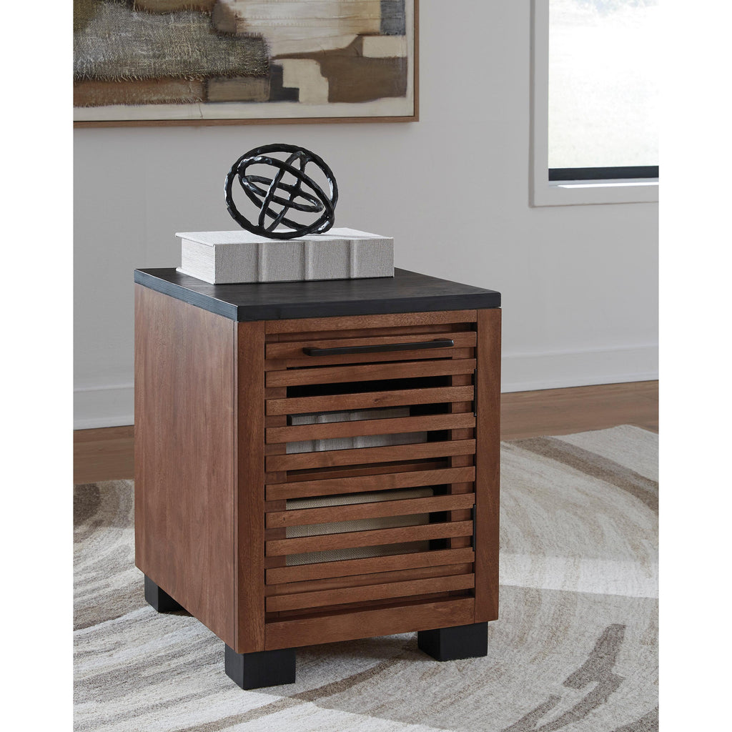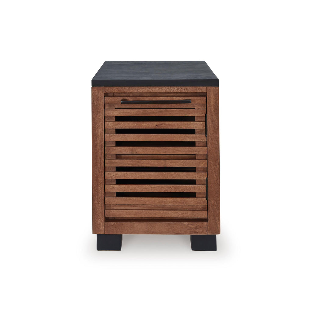 • Two-tone finish (medium warm brown wood tone and matte black)