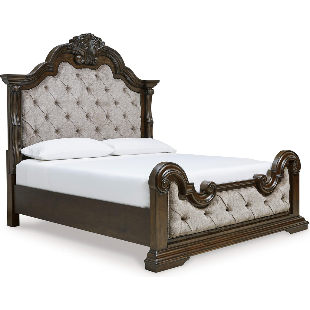From its ornamental appliques to its large scale, this king upholstered bed makes a bold statement. Showcasing sculptural ornate details... From its ornamental appliques to its large scale, this king upholstered bed makes a bold statement. Showcasing sculptural ornate details and button tufting, this opulent bed wows with stunning style. The look is timeless. The feel? Right at home. Matching dresser, mirror, chest and 2 nightstands included. View more