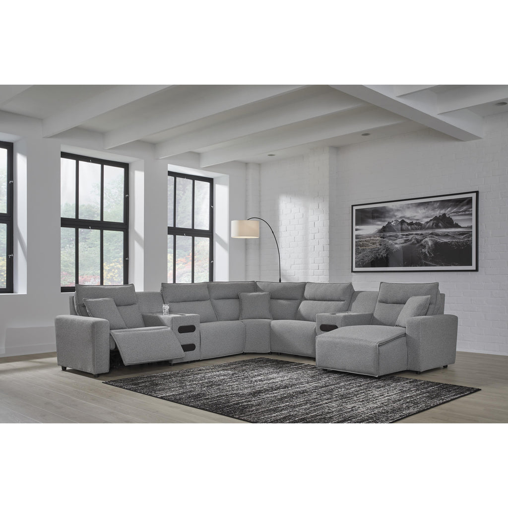 • Includes 7 modular pieces: left-arm facing power recliner, power armless recliner, armless chair, wedge, 2 consoles with audio systems and right-arm facing power reclining back chaise