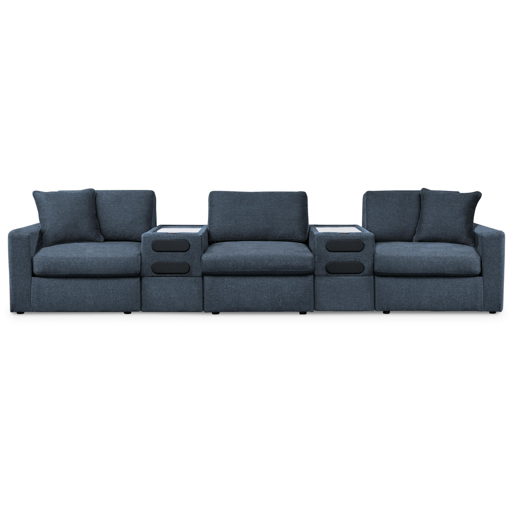 • Includes 5 modular pieces: left-arm facing corner chair, armless chair, 2 audio consoles with storage and right-arm facing corner chair