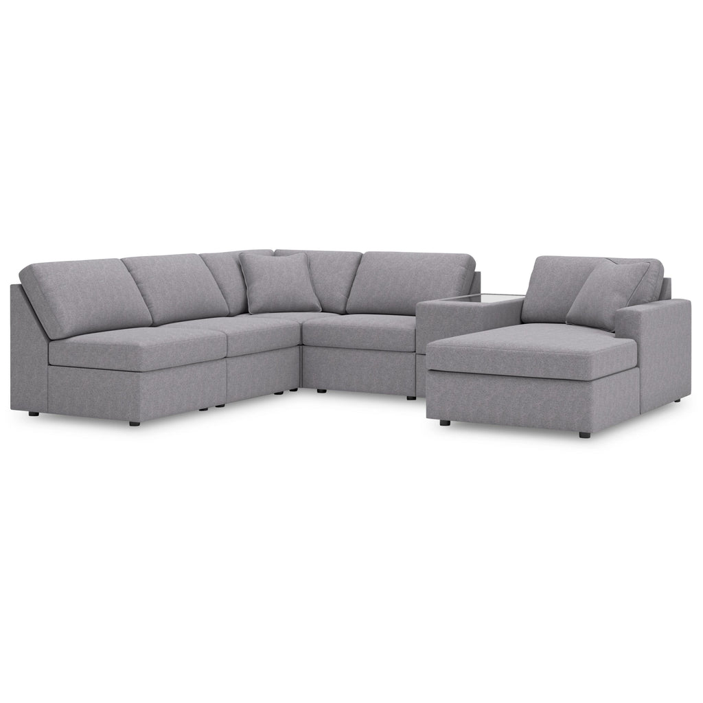 • Includes 6 modular pieces: right-arm facing corner chaise, 3 armless chairs, wedge and console with storage