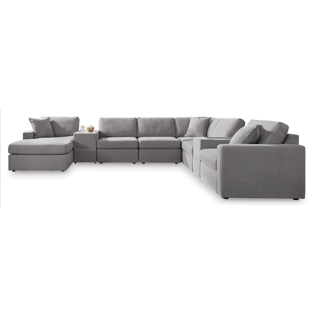 • Includes 8 modular pieces: left-arm facing corner chaise, 3 armless chairs, 2 consoles with storage, wedge and right-arm facing corner chair