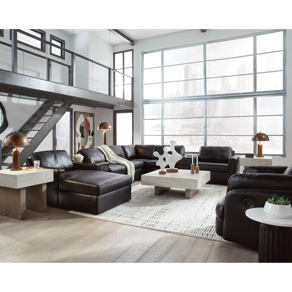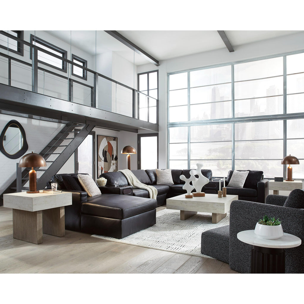 • Includes 8 modular pieces: left-arm facing corner chaise, wedge, 2 consoles with audio systems, 3 armless chairs and right-arm facing corner chair