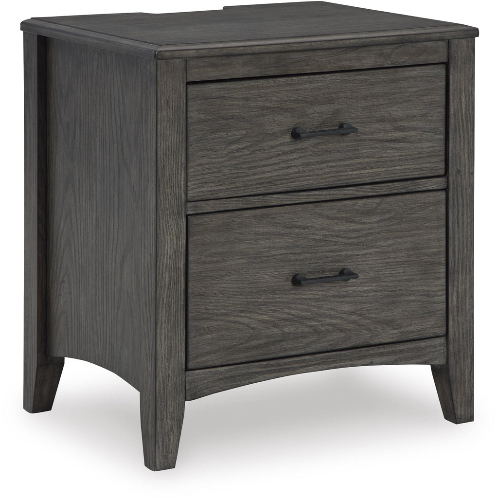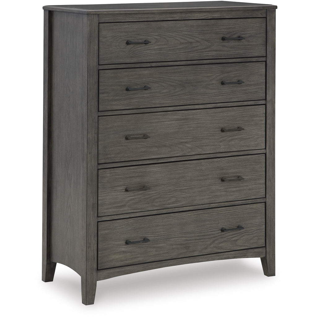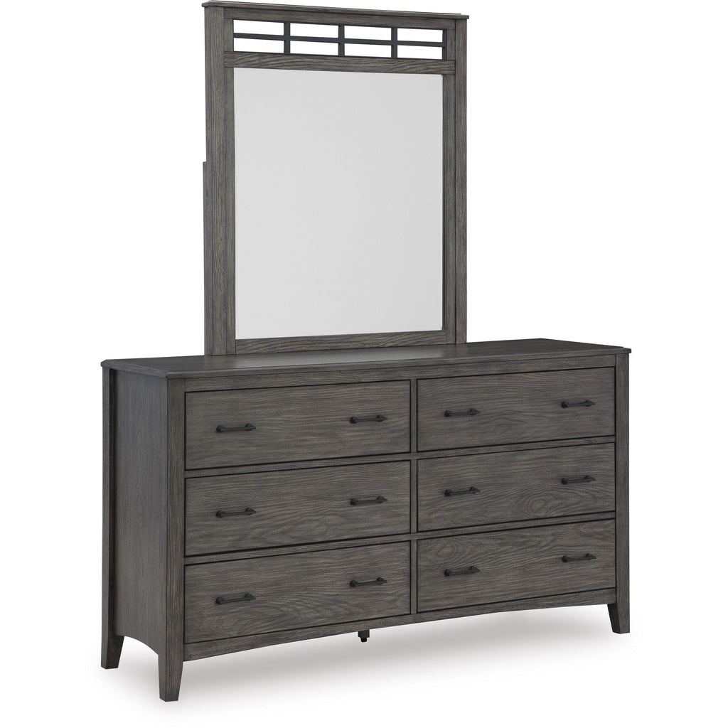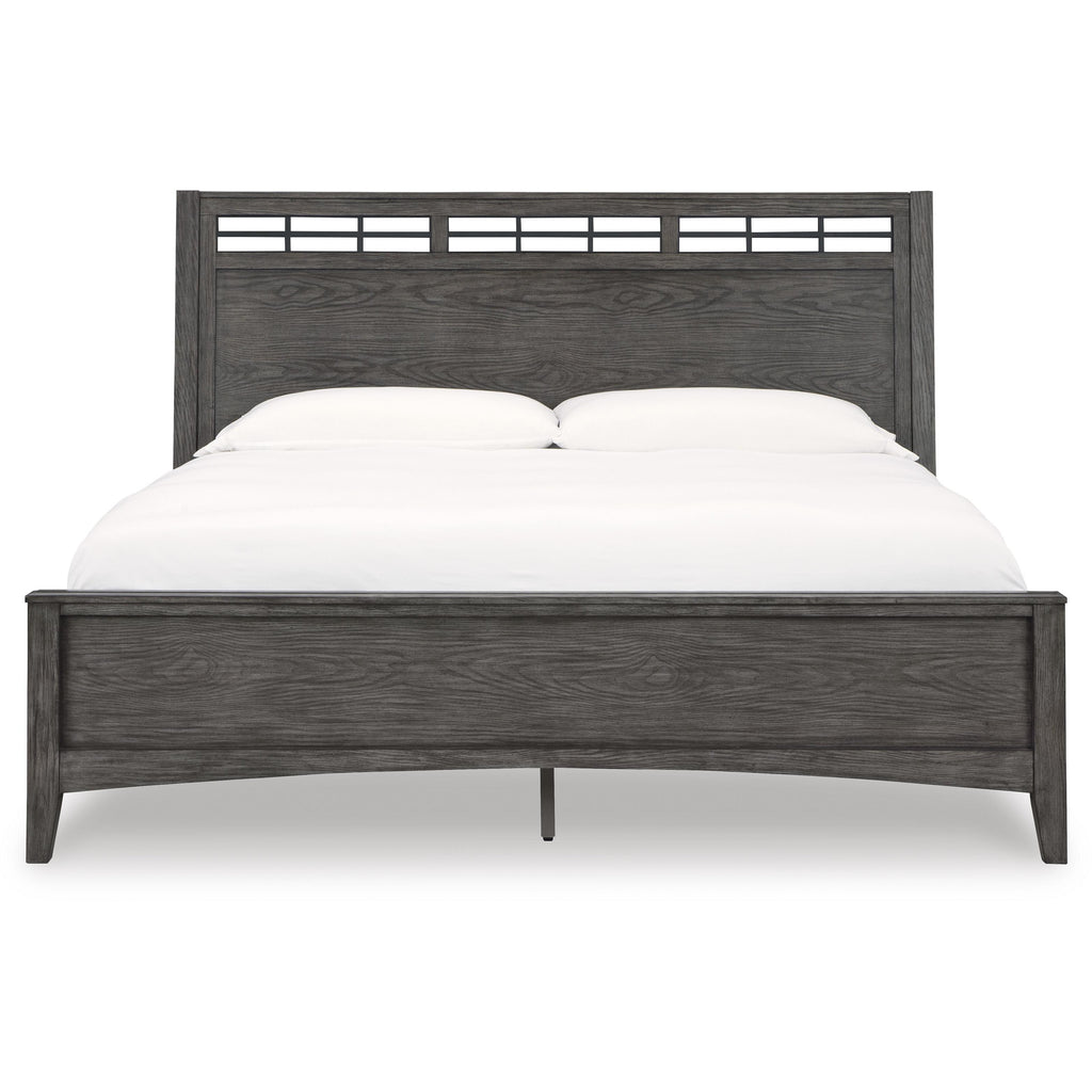 Cool and clean, yet warm and inviting. This Montillan 8-piece king panel bedroom set has so many great qualities, making... Cool and clean, yet warm and inviting. This Montillan 8-piece king panel bedroom set has so many great qualities, making it an inspired choice for your dream destination. A prime example of “casual contemporary” style at its very best. It features an embossed wood grain texture, and a medium gray-brown finish with a blackened wood grain contrast. This set includes a king panel headboard, footboard, rails, dresser, mirror, chest, and 2 nightstands. View more