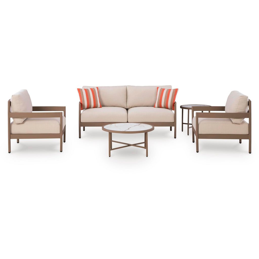 Indulgently comfortable furniture shouldn't be limited to inside spaces. Create your own outdoor oasis with this 5-piece outdoor ensemble. It's... Indulgently comfortable furniture shouldn't be limited to inside spaces. Create your own outdoor oasis with this 5-piece outdoor ensemble. It's a study in form and function, with clean-lined, durable aluminum frames that are ready for many seasons of fun in the sun. Plush lounge chair and loveseat cushions wrapped in high-performing Nuvella® fabric are comfortable and carefree, while sintered stone tabletops lend an air of natural elegance. View more