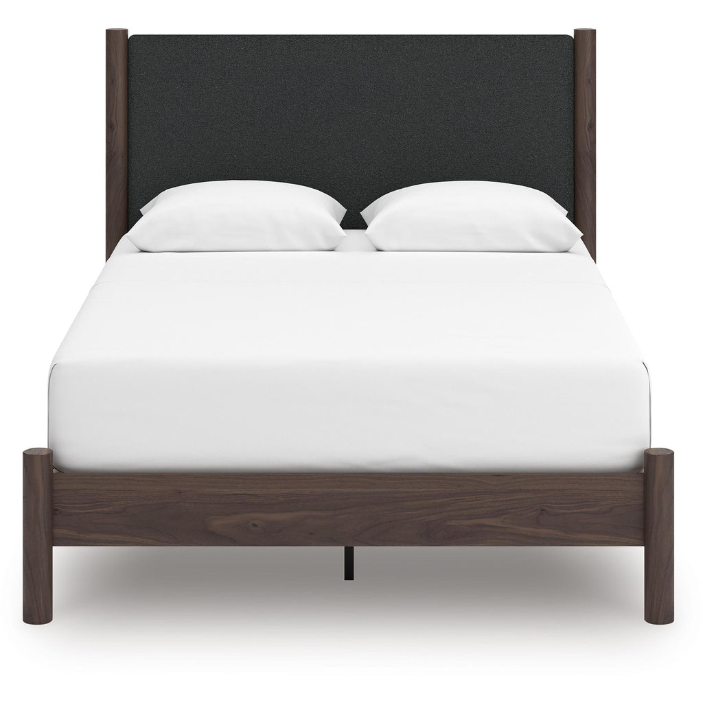• Includes upholstered panel headboard, platform footboard with rails and roll slats