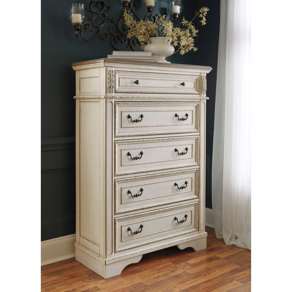 Elevating the art of traditional cottage styling, this bedroom set is your dream bedroom retreat realized. Antiqued two-tone aesthetic blends... Elevating the art of traditional cottage styling, this bedroom set is your dream bedroom retreat realized. Antiqued two-tone aesthetic blends a chipped white with a distressed wood finished top for added charm. Framed drawer fronts and decorative corbels add refinement, while bail pulls in a dark bronze-tone finish lend a classic touch. This set includes a king upholstered panel headboard, footboard and rails as well as a dresser, mirror, nightstand and chest. View more