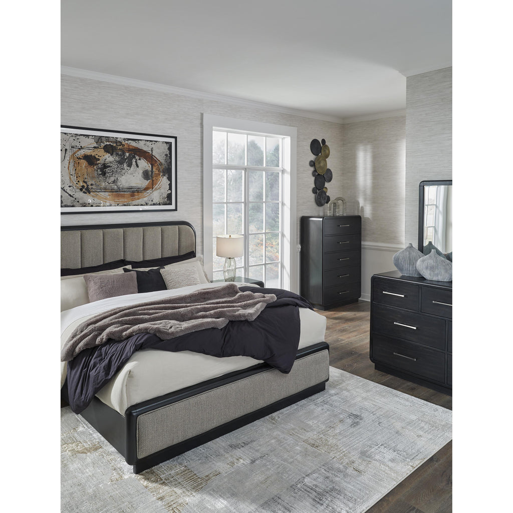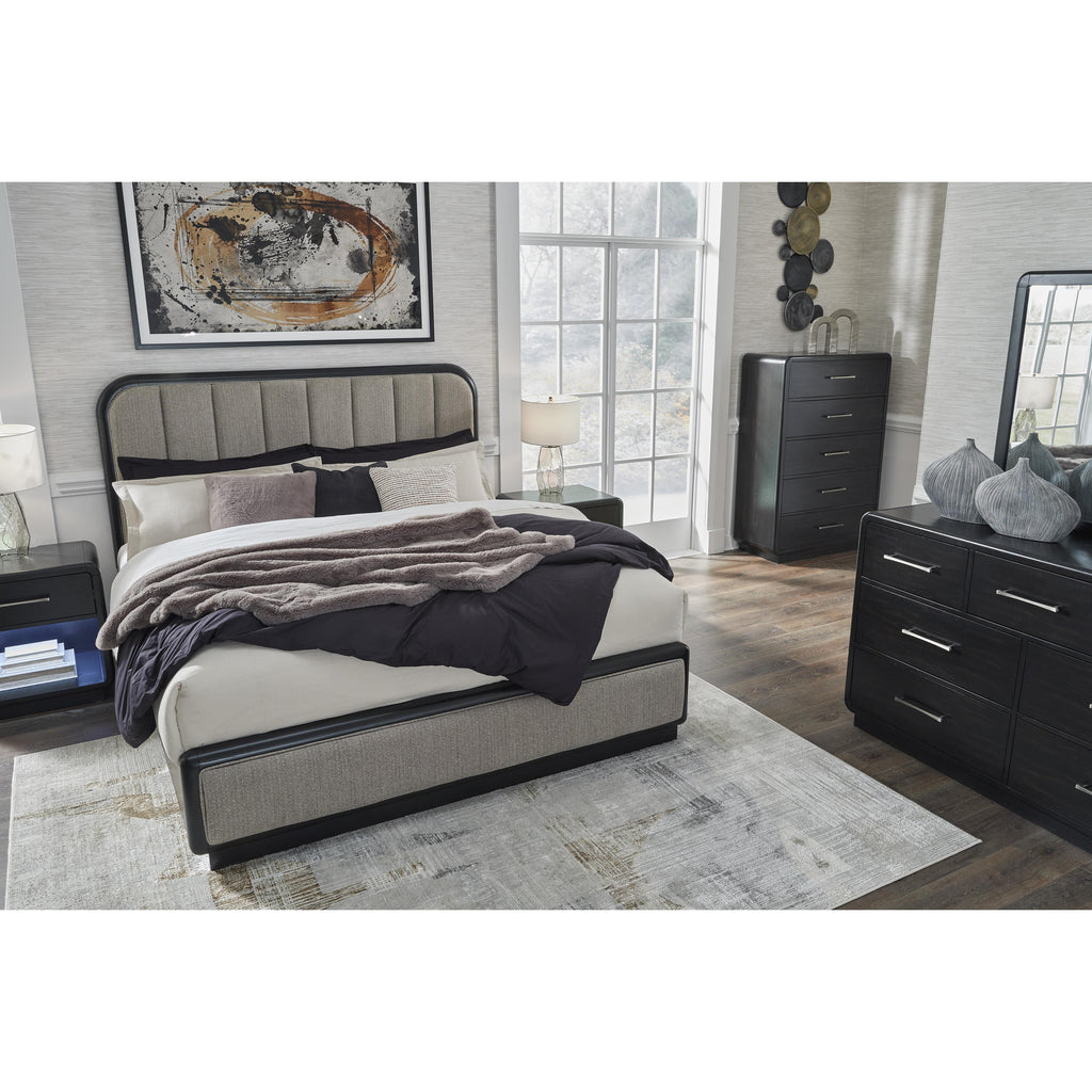 • Includes upholstered panel headboard, footboard and rails