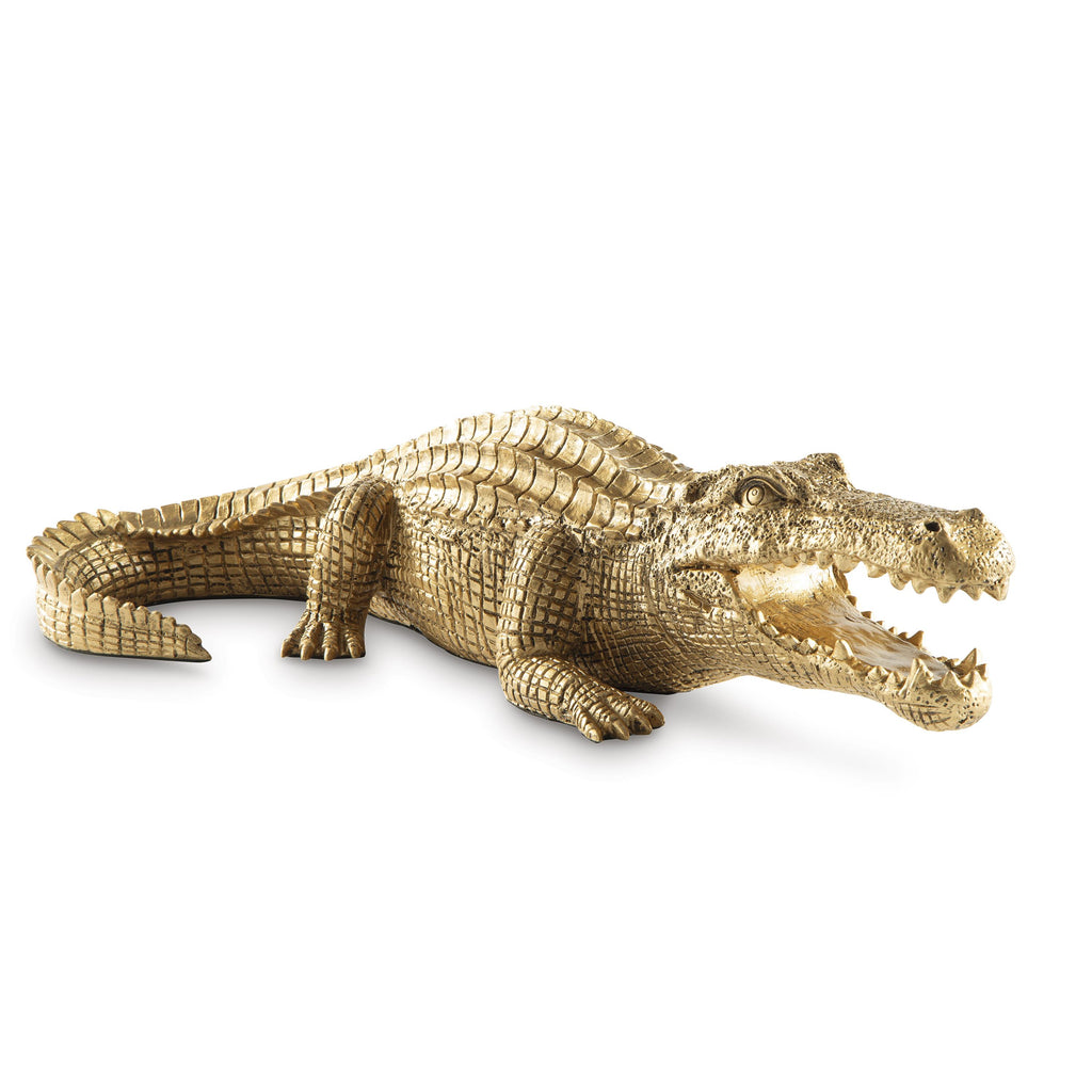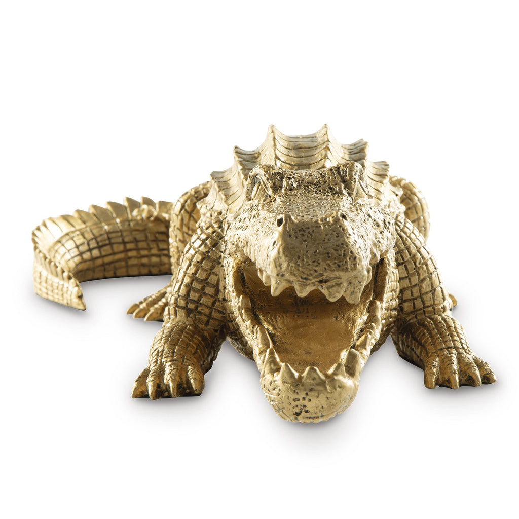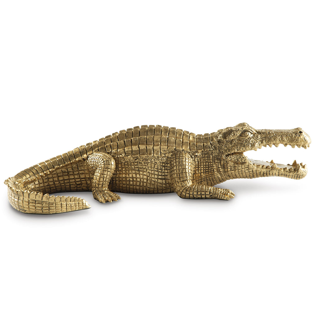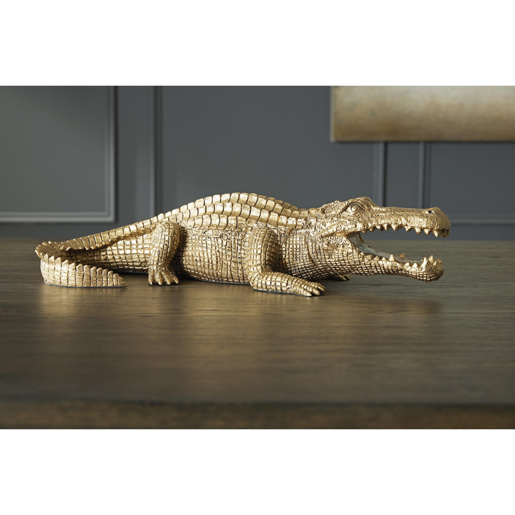 This sculpture brings a glam appeal to wild style. Luxe in an antiqued goldtone finish, the alligator-shaped art piece is... This sculpture brings a glam appeal to wild style. Luxe in an antiqued goldtone finish, the alligator-shaped art piece is a snappy addition to your office or living room decor. Its remarkable attention to detail captures the animal's likeness in decidedly contemporary fashion. View more