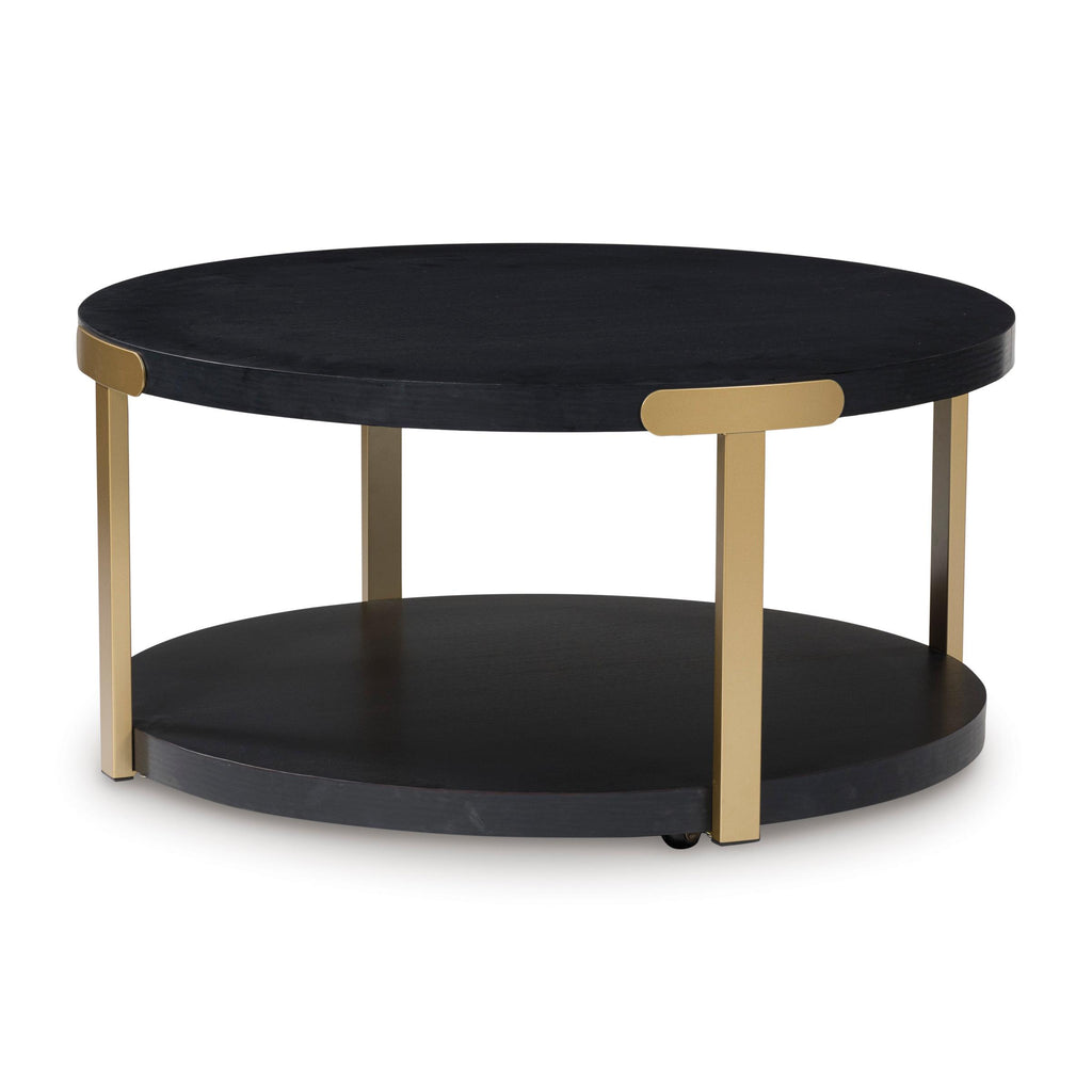 Reflect your cool, contemporary eye for design with this table set. Pairing a gleaming goldtone finish and black wood grain... Reflect your cool, contemporary eye for design with this table set. Pairing a gleaming goldtone finish and black wood grain pattern, it crafts a luxe look for your living room. The lower shelves are well-suited for displaying your favorite decor, while casters on the coffee table offer added flexibility. View more