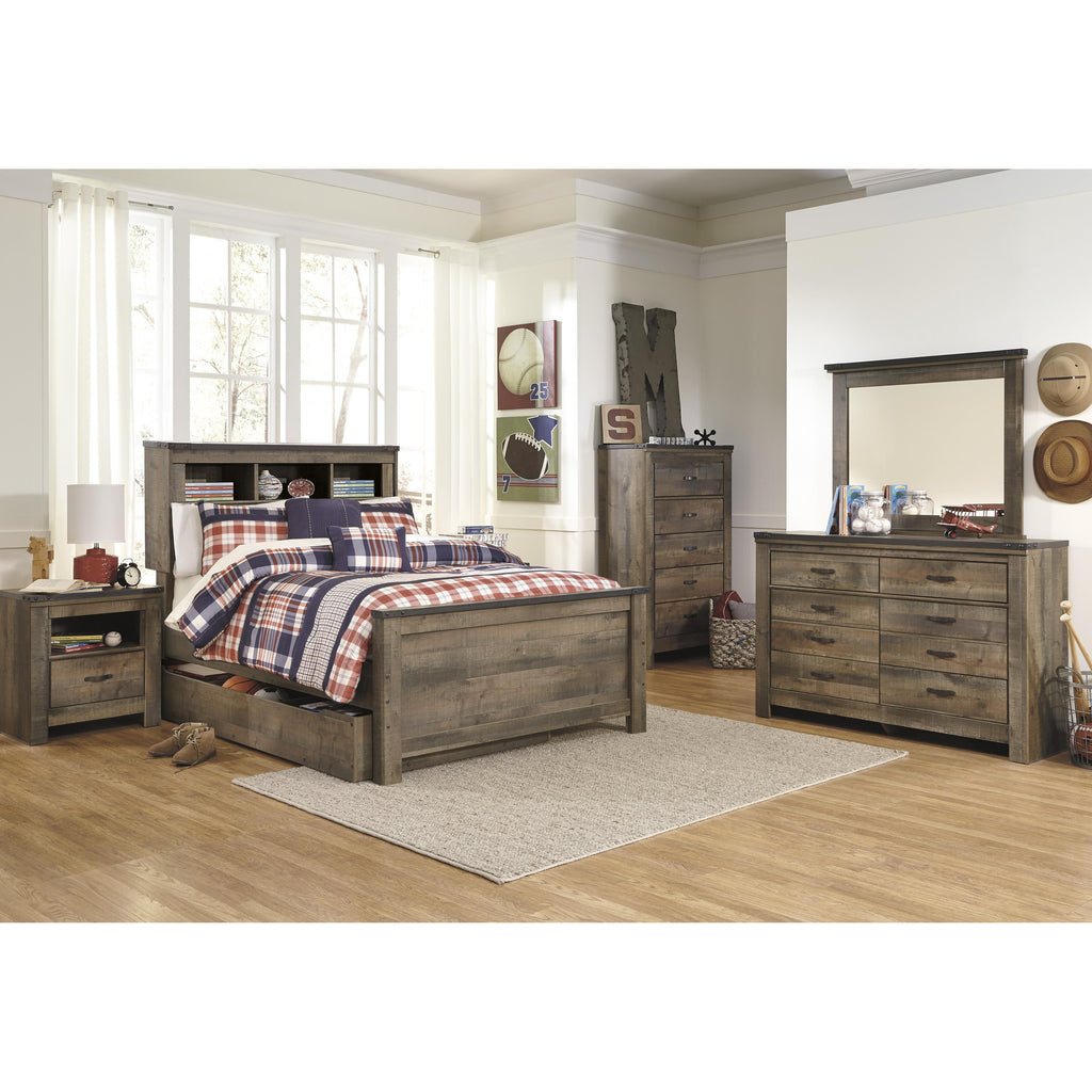 • Includes bookcase headboard, panel footboard, panel rails, roll slats and under bed storage unit