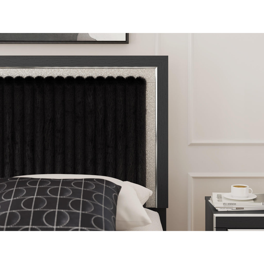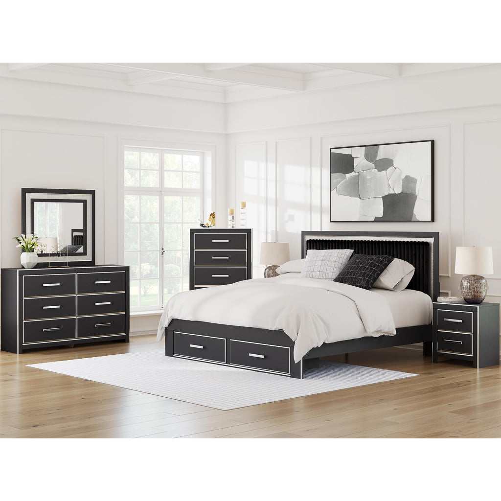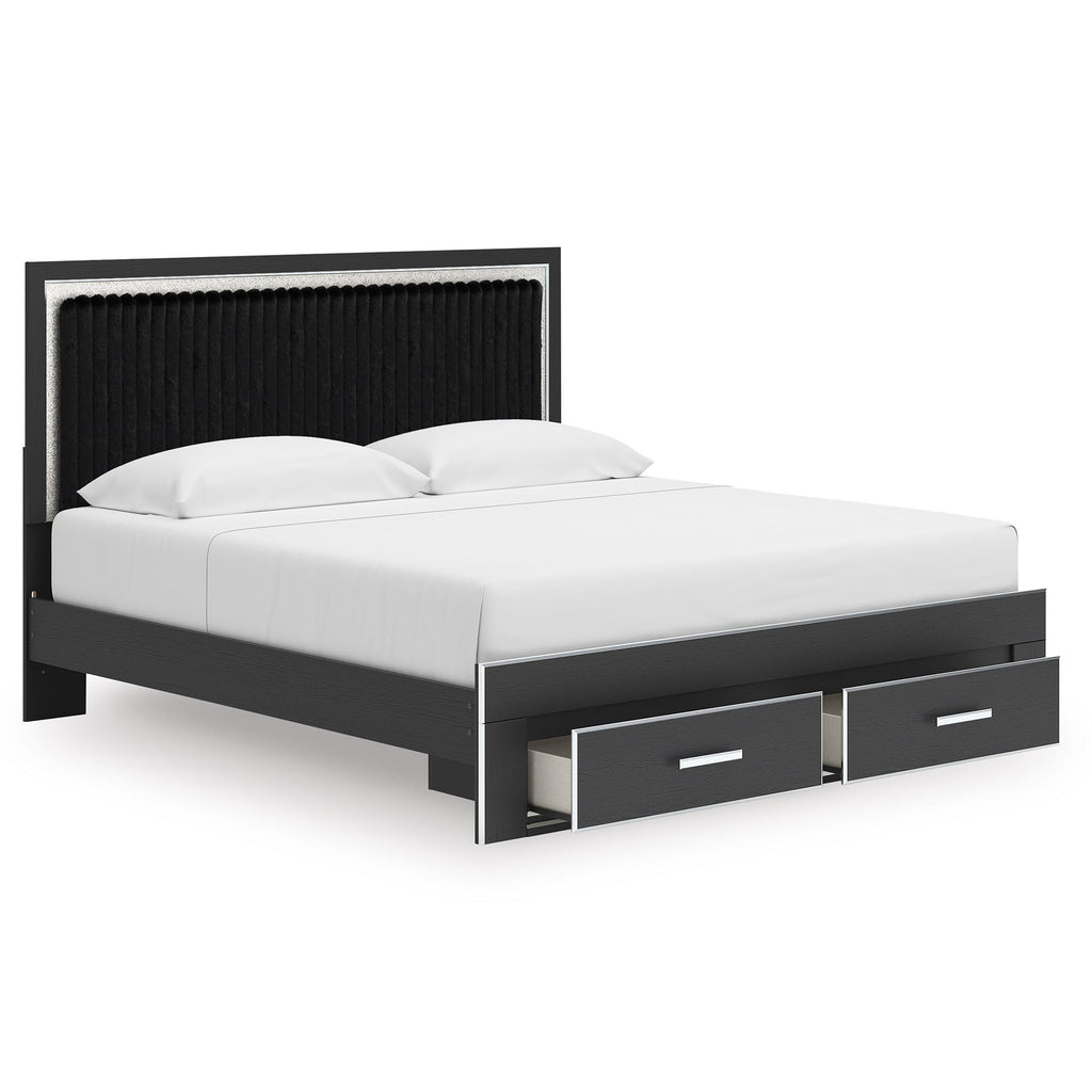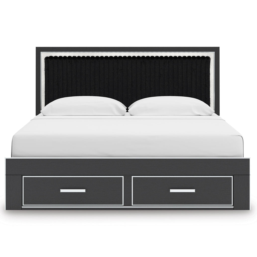 • Includes upholstered panel headboard, storage footboard, platform rails and roll slats